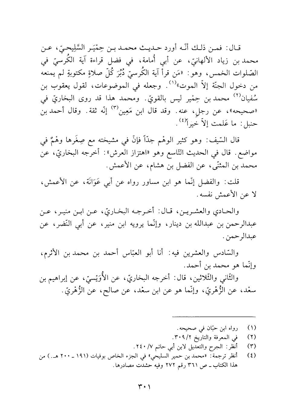 قال السّيف: وهو كثير الوهْم جدّا فإنّ فِي مشيخته مع صِغَرها وهْمٌ فِي مواضع. قال فِي الحديث التّاسع وهو «اهتزاز العرش» : أَخْرَجَهُ البخاريّ، عن مُحَمَّد بْن المثنّى، عن الفضل بن هشام، عن الْأَعْمَشُ.