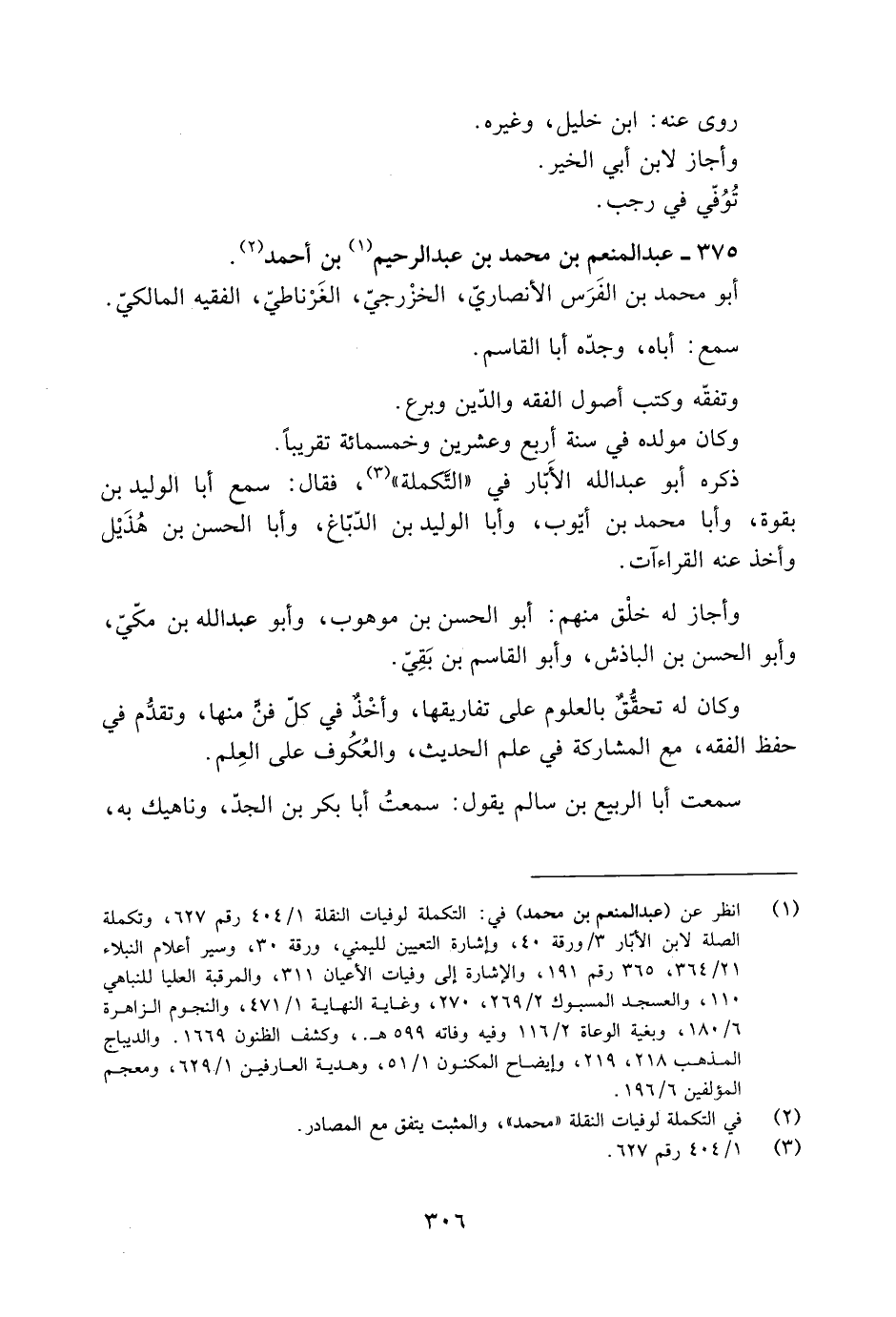 [1] انظر عن (عبد المنعم بن محمد) في: التكملة لوفيات النقلة 1/ 404 رقم 627، وتكملة الصلة لابن الأبّار 3/ ورقة 40، وإشارة التعيين لليمني، ورقة 30، وسير أعلام النبلاء 21/ 364، 365 رقم 191، والإشارة إلى وفيات الأعيان 311، والمرقبة العليا للنباهي 110، والعسجد المسبوك 2/ 269، 270، وغاية النهاية 1/ 471، والنجوم الزاهرة 6/ 180، وبغية الوعاة 2/ 116 وفيه وفاته 599 هـ.، وكشف الظنون 1669. والديباج المذهب 218، 219، وإيضاح المكنون 1/ 51، وهدية العارفين 1/ 629، ومعجم المؤلفين 6/ 196.
