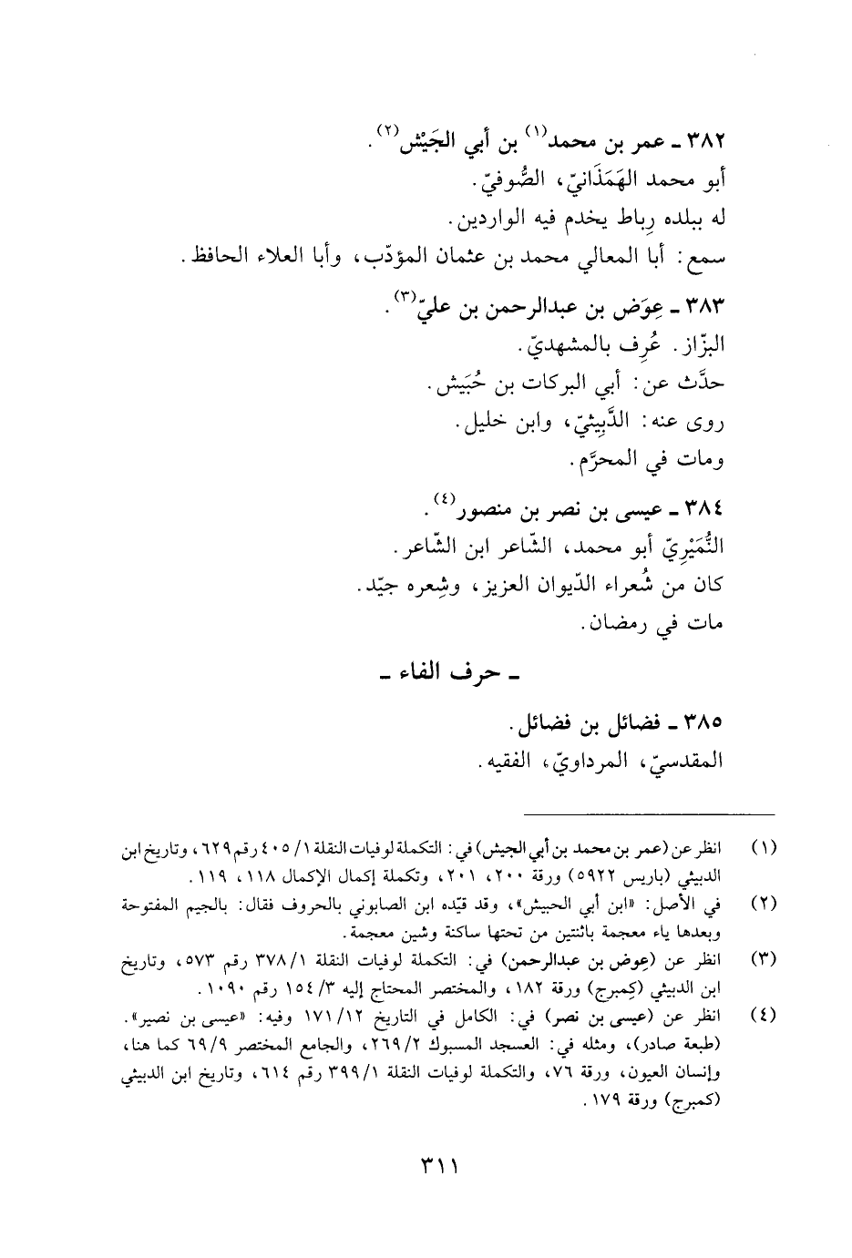 [1] انظر عن (عمر بن محمد بن أبي الجيش) في: التكملة لوفيات النقلة 1/ 405 رقم 629، وتاريخ ابن الدبيثي (باريس 5922) ورقة 200، 201، وتكملة إكمال الإكمال 118، 119.