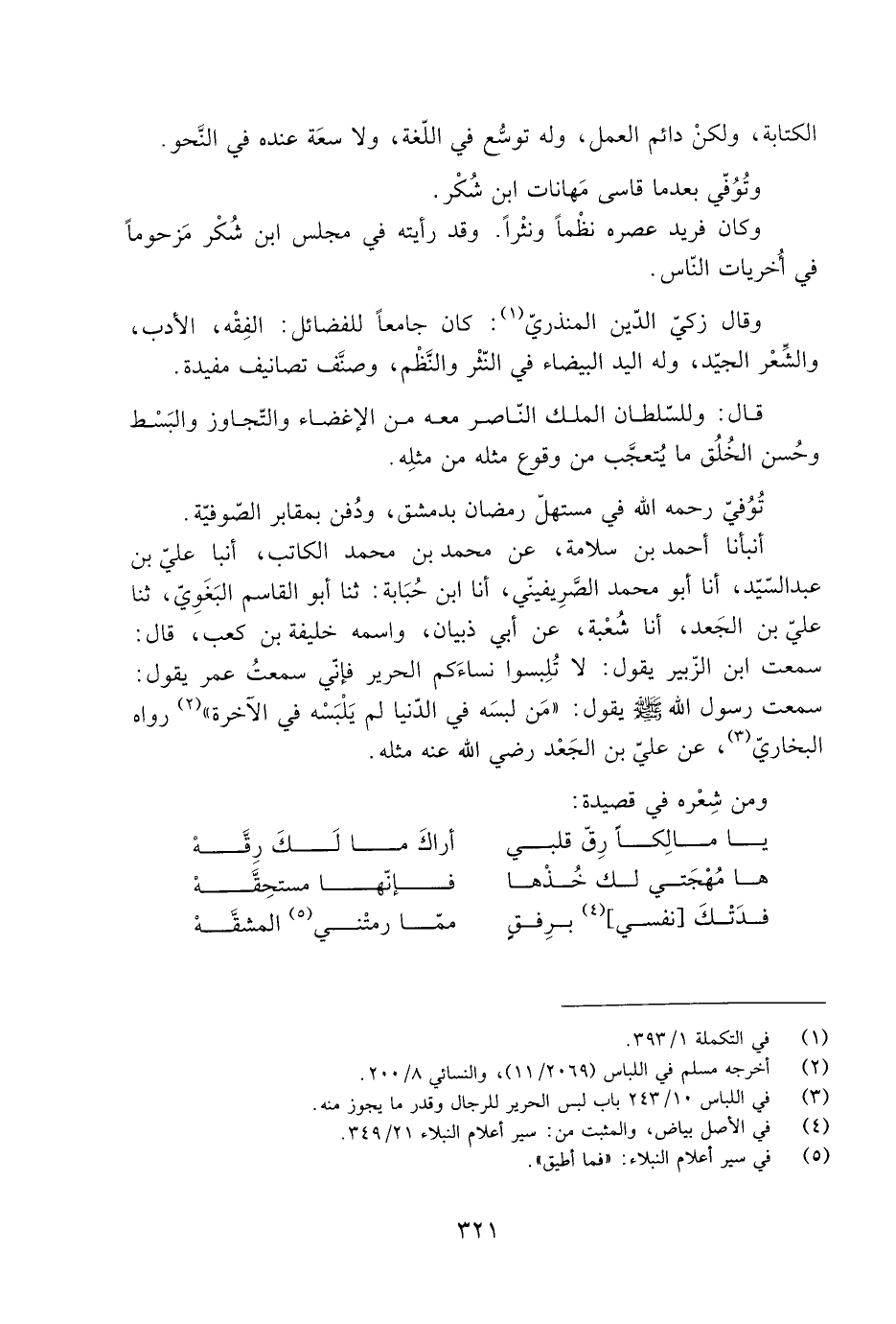 سَمِعْتُ رَسُولَ اللَّهِ صَلَّى اللَّهُ عَلَيْهِ وَسَلَّمَ يقول: «مَن لبسَه فِي الدّنيا لم يلبسه في الآخرة» [2] رواه الْبُخَارِيّ [3] ، عن عليّ بْن الْجَعْد رَضِيَ اللَّه عَنْهُ مثله. ومن شِعْره فِي قصيدة:
