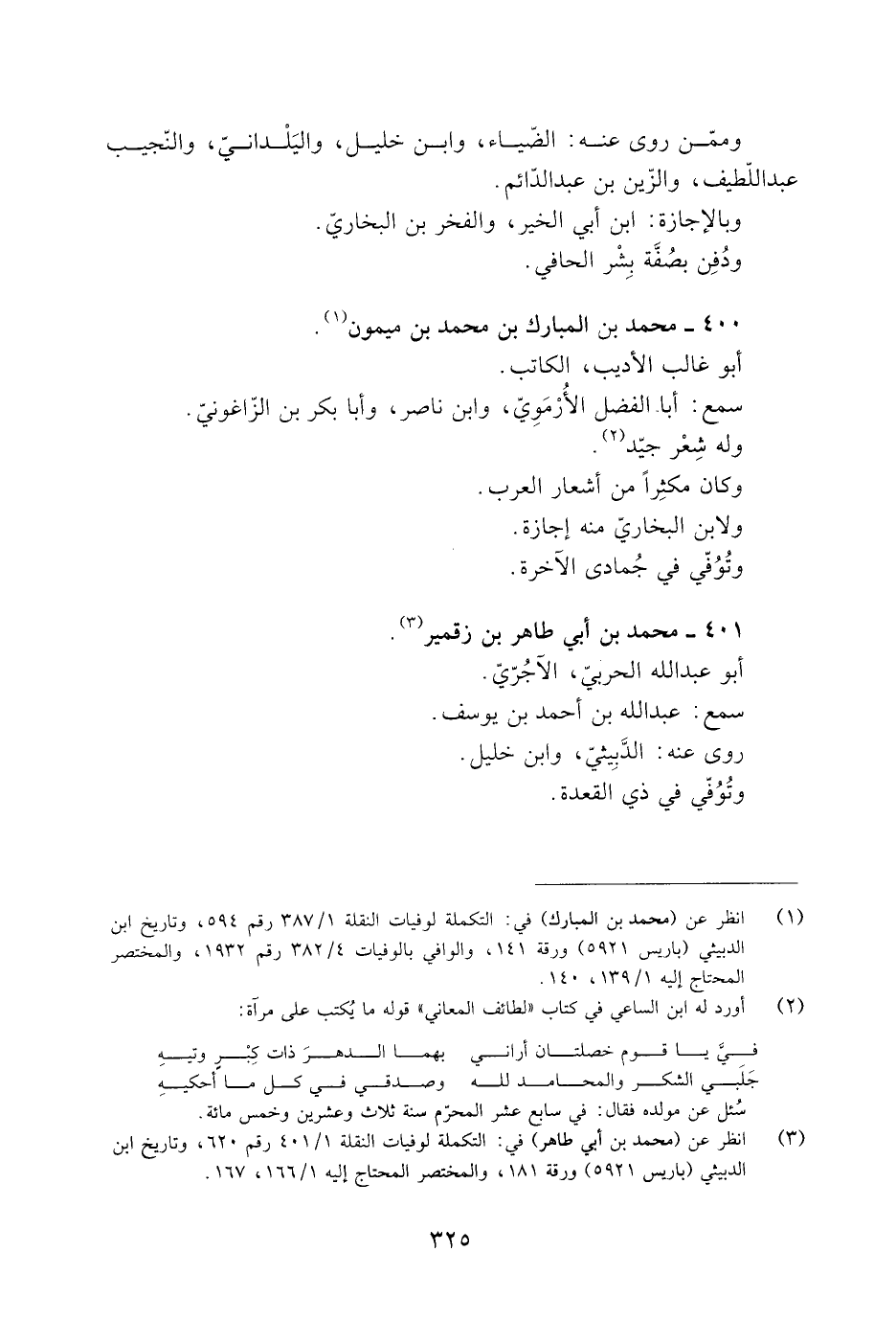 [3] انظر عن (محمد بن أبي طاهر) في: التكملة لوفيات النقلة 1/ 401 رقم 620، وتاريخ ابن الدبيثي (باريس 5921) ورقة 181، والمختصر المحتاج إليه 1/ 166، 167.