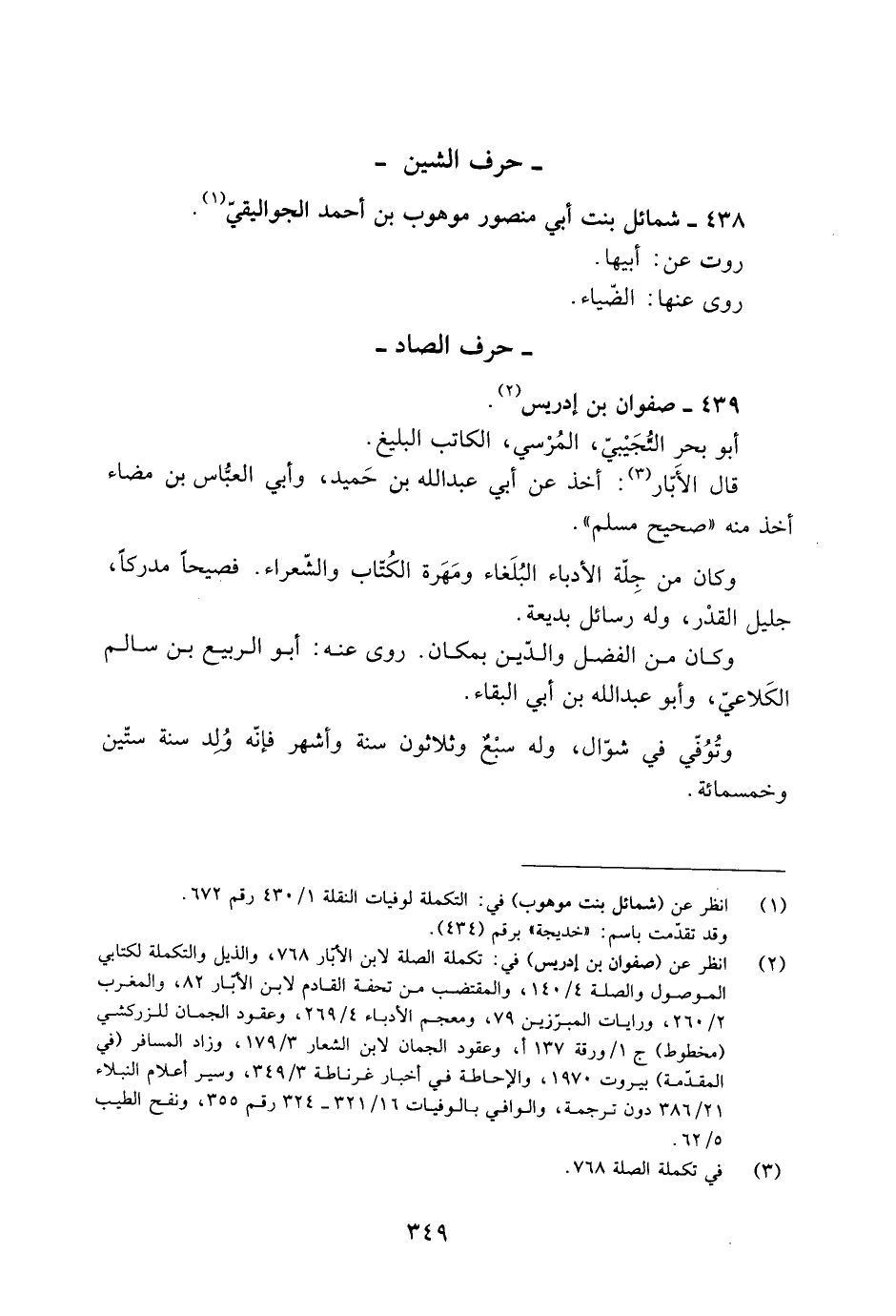 [2] انظر عن (صفوان بن إدريس) في: تكملة الصلة لابن الأبّار 768، والذيل والتكملة لكتابي الموصول والصلة 4/ 140، والمقتضب من تحفة القادم لابن الأبّار 82، والمغرب 2/ 260، ورايات المبرّزين 79، ومعجم الأدباء 4/ 269، وعقود الجمان للزركشي (مخطوط) ج 1/ ورقة 137 أ، وعقود الجمان لابن الشعار 3/ 179، وزاد المسافر (في المقدّمة) بيروت 1970، والإحاطة في أخبار غرناطة 3/ 349، وسير أعلام النبلاء 21/ 386 دون ترجمة، والوافي بالوفيات 16/ 321- 324 رقم 355، ونفح الطيب 5/ 62.