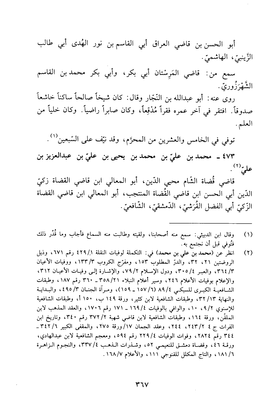[2] انظر عن (محمد بن علي بن محمد) في: التكملة لوفيات النقلة 1/ 429 رقم 671، وذيل الروضتين 21، 32، والدرّ المطلوب 153، ومفرّج الكروب 3/ 133، ووفيات الأعيان 3/ 364، والعبر 4/ 305، ودول الإسلام 2/ 79، والإشارة إلى وفيات الأعيان 312، والإعلام بوفيات الأعلام 246، وسير أعلام النبلاء 21/ 358- 360 رقم 187، وطبقات الشافعية الكبرى للسبكي 4/ 89 (6/ 157- 159) ، ومرآة الجنان 3/ 495، والبداية والنهاية 13/ 32، وطبقات الشافعية لابن كثير، ورقة 149 ب، 150 أ، وطبقات الشافعية للإسنويّ 2/ 9، 10، والوافي بالوفيات 4/ 169- 171 رقم 1706، والعقد المذهب لابن الملقّن، ورقة 164، وطبقات الشافعية لابن قاضي شهبة 2/ 372 رقم 340، وتاريخ ابن الفرات ج 4 2/ 243، 244، وعقد الجمان 17/ ورقة 275، والمقفى الكبير 6/ 342- 344 رقم 2824، وفوات الوفيات 4/ 229 رقم 594، ومعجم الشافعية لابن عبد الهادي، ورقة 46، وقضاة دمشق للنعيمي 52، وشذرات الذهب 4/ 337، والنجوم الزاهرة 6/ 181، والتاج المكلل للقنوجي 111، والأعلام 7/ 168.