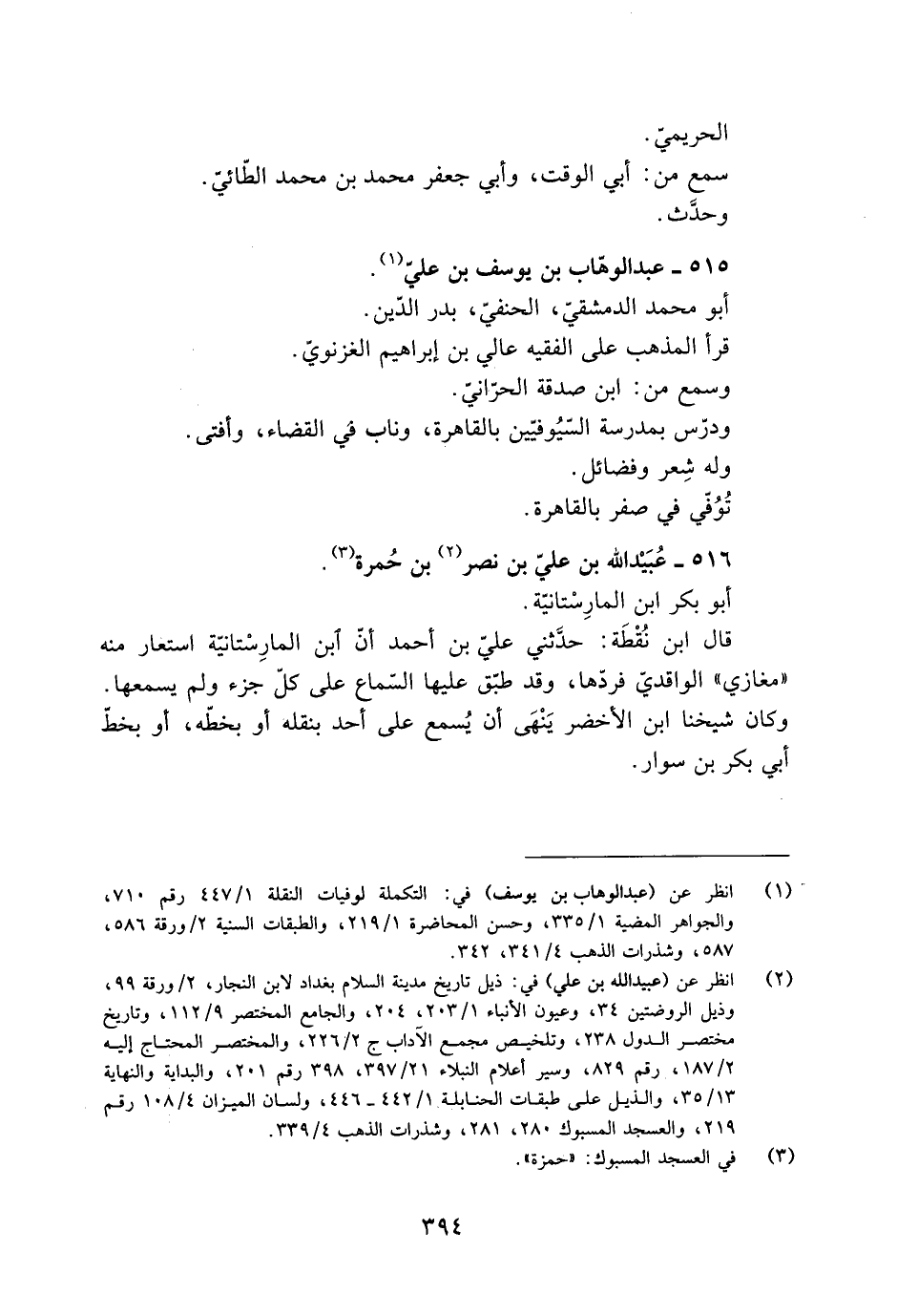 [1] انظر عن (عبد الوهاب بن يوسف) في: التكملة لوفيات النقلة 1/ 447 رقم 710، والجواهر المضية 1/ 335، وحسن المحاضرة 1/ 219، والطبقات السنية 2/ ورقة 586، 587، وشذرات الذهب 4/ 341، 342.