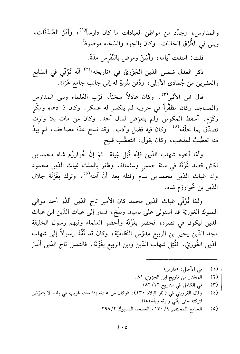 وأمّا أخوه شهاب الدّين فإنّه قُتِلَ غِيلة. ثُمَّ إنّ خُوارزْم شاه مُحَمَّد بْن تكش قصد غَزْنَة فِي سنة خمسٍ وستّمائة، وظفر بالملك غياث الدّين محمود ولد غياث الدّين مُحَمَّد بْن سام وقتله بعد أنْ آمنه [5] ، وترك بغَزْنَة جلال الدّين بْن خُوارزم شاه.