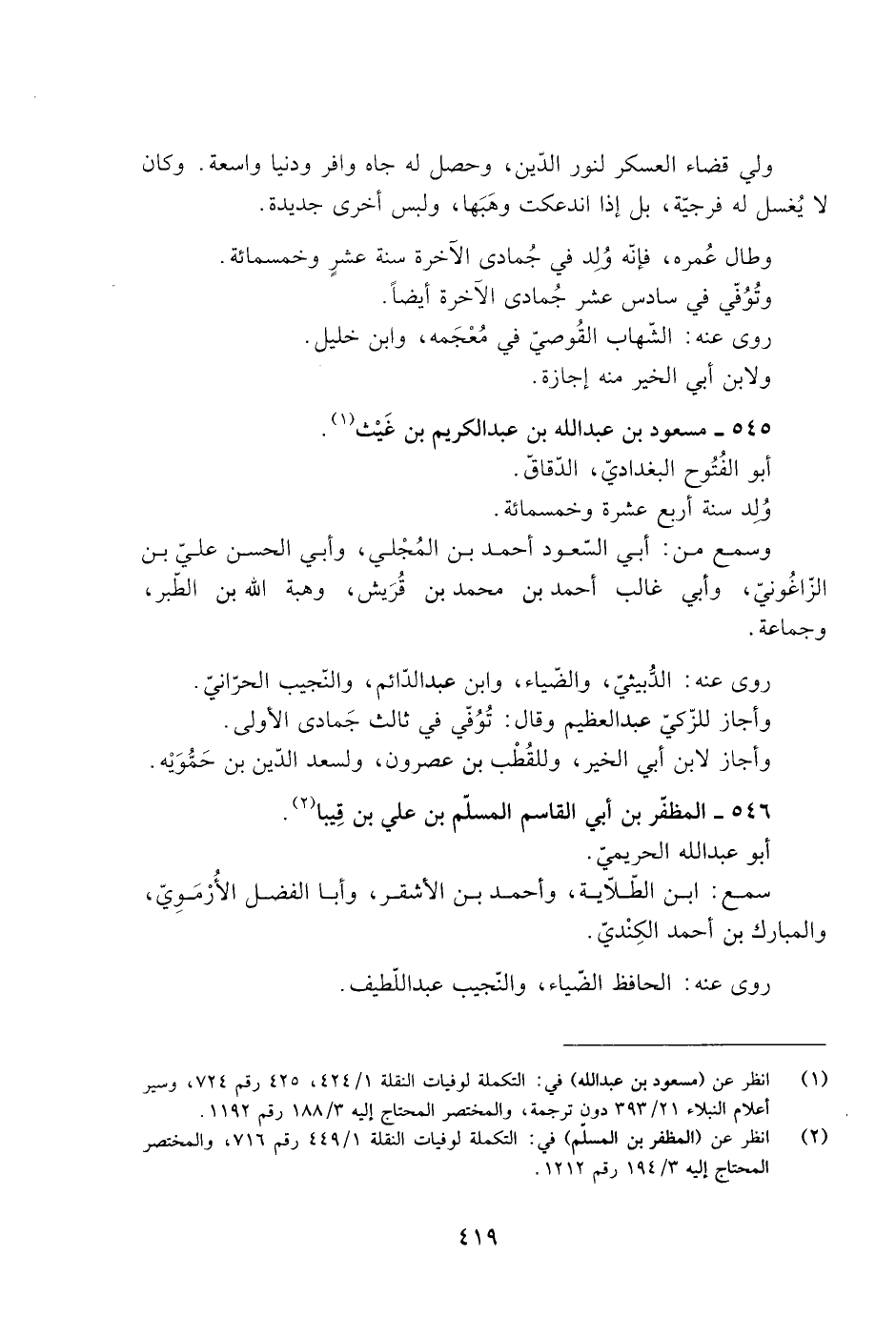 [1] انظر عن (مسعود بن عبد الله) في: التكملة لوفيات النقلة 1/ 424، 425 رقم 724، وسير أعلام النبلاء 21/ 393 دون ترجمة، والمختصر المحتاج إليه 3/ 188 رقم 1192.