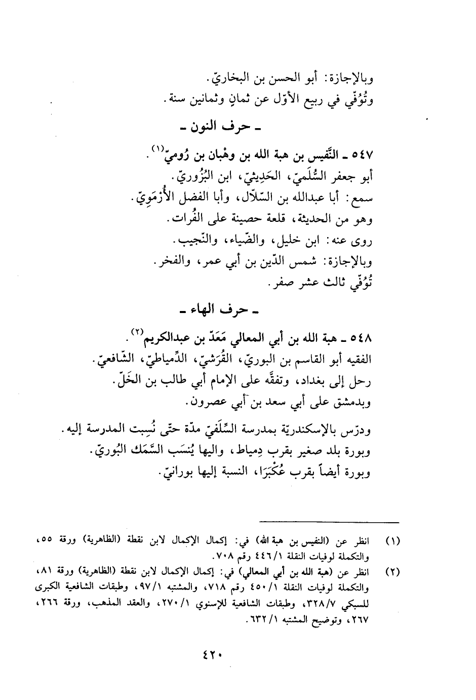 [1] انظر عن (النفيس بن هبة الله) في: إكمال الإكمال لابن نقطة (الظاهرية) ورقة 55، والتكملة لوفيات النقلة 1/ 446 رقم 708.