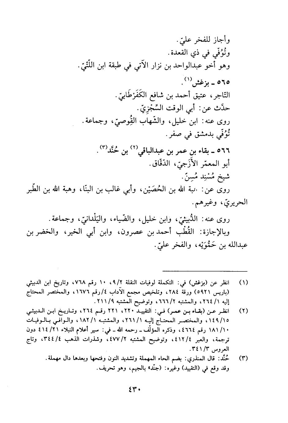 [1] انظر عن (بزغش) في: التكملة لوفيات النقلة 2/ 9، 10 رقم 768، وتاريخ ابن الدبيثي (باريس 5921) ورقة 284، وتلخيص مجمع الآداب 4/ رقم 1676، والمختصر المحتاج إليه 1/ 264، والمشتبه 2/ 666، وتوضيح المشتبه 9/ 211.
