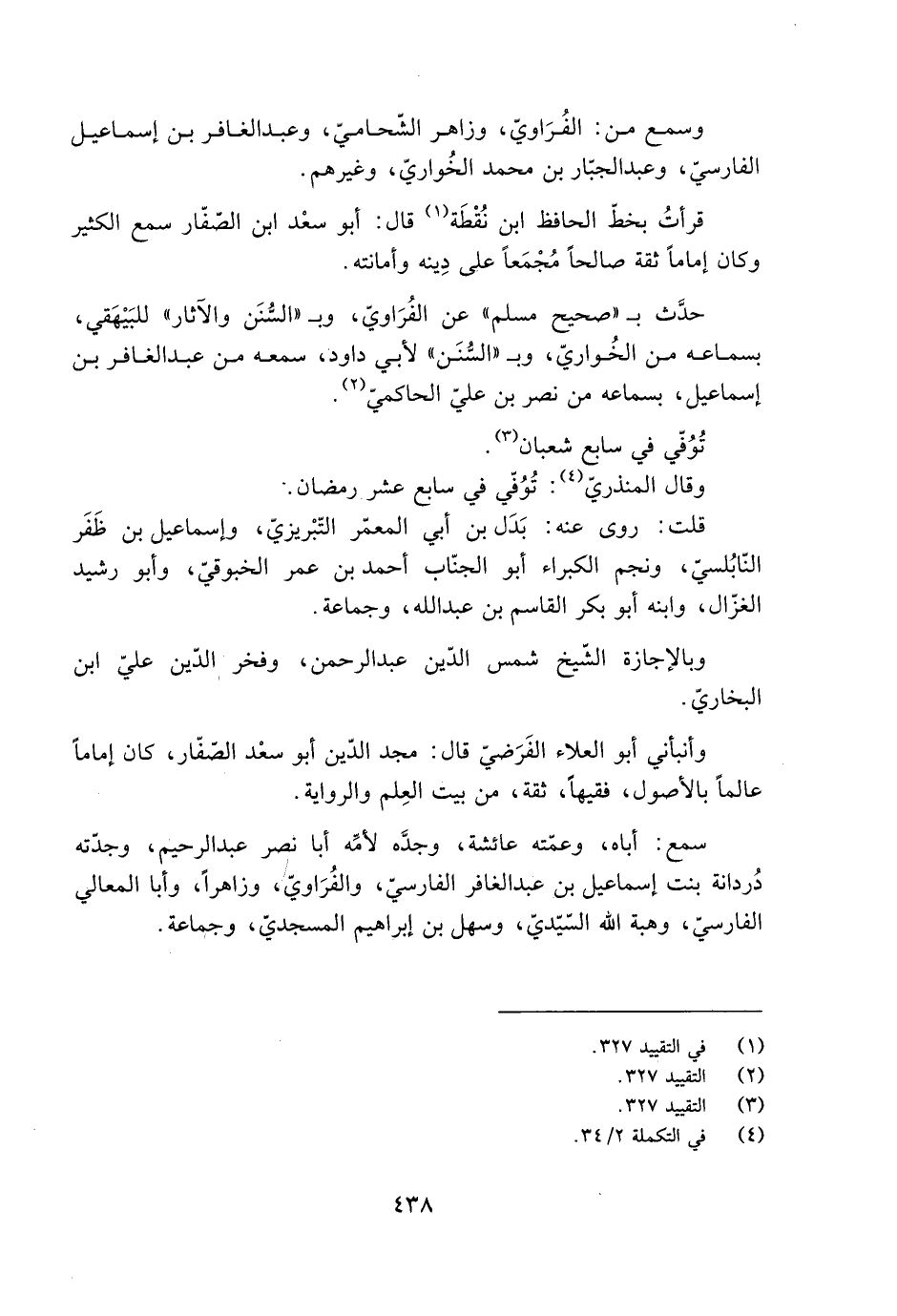 وأنبأني أبو العلاء الفَرَضيّ قال: مجد الدّين أبو سعْد الصّفّار، كان إماما عالما بالأصول، فقيها، ثقة، من بيت العِلم والرواية.