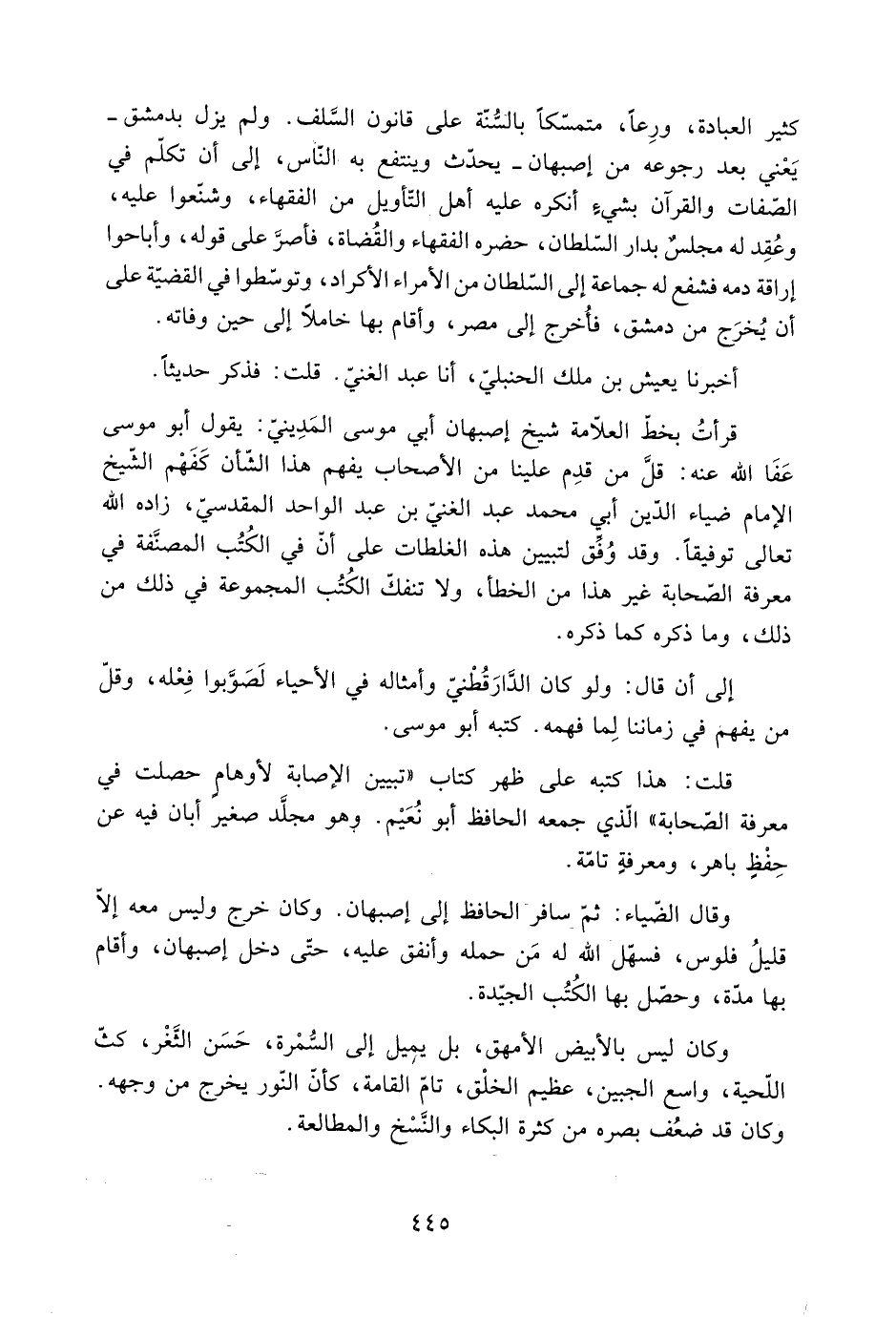 قرأتُ بخطّ العلّامة شيخ أصبهان أَبِي مُوسَى المَدِينيّ: يقول أبو مُوسَى عَفَا اللَّه عَنْهُ: قلَّ من قدِم علينا من الأصحاب يفهم هذا الشّأن كَفَهْم الشّيخ الْإِمَام ضياء الدّين أَبِي مُحَمَّد عَبْد الغنيّ بْن عَبْد الواحد المقدسيّ، زاده اللَّه تعالى توفيقا. وقد وُفِّق لتبيين هَذِهِ الغلطات على أنّ فِي الكُتُب المصنَّفة فِي معرفة الصّحابة غير هَذَا من الخطأ، ولا تنفكّ الكُتُب المجموعة فِي ذلك من ذلك، وما ذكره كما ذكره.