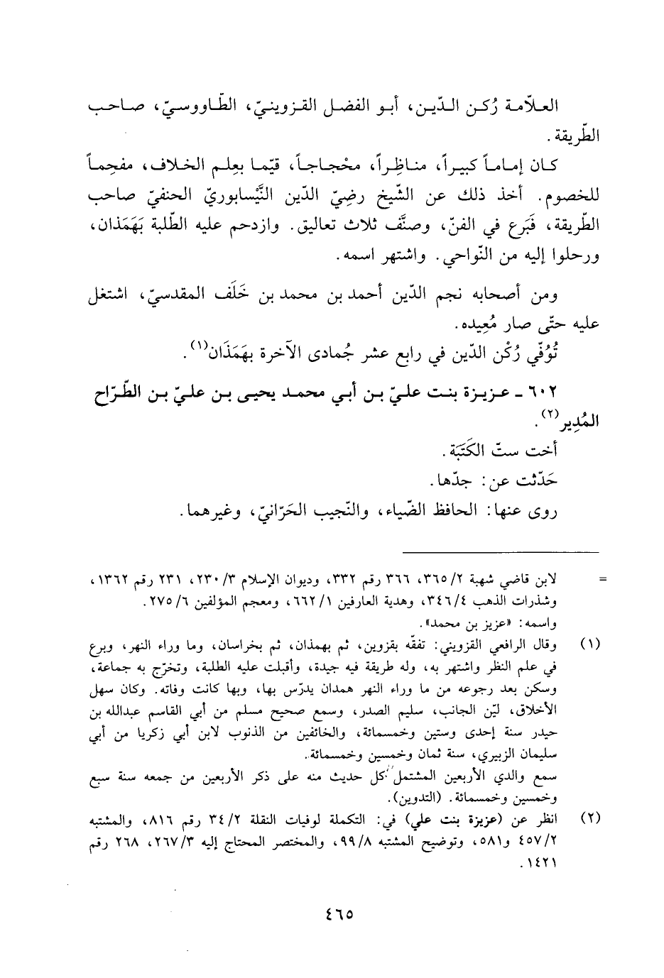 602- عزيزة بِنْت عليّ بْن أَبِي مُحَمَّد يحيى بْن عليّ بْن الطّرّاح المُدِير [2] .
