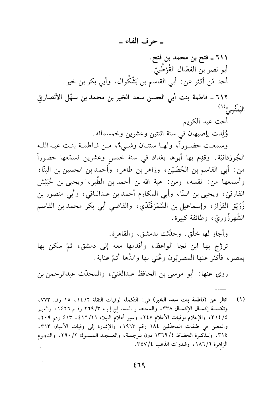 [1] انظر عن (فاطمة بنت سعد الخير) في: التكملة لوفيات النقلة 2/ 14، 15 رقم 773، وتكملة إكمال الإكمال 338، والمختصر المحتاج إليه 3/ 269 رقم 1426، والعبر 4/ 314، والإعلام بوفيات الأعلام 247، وسير أعلام النبلاء 21/ 412، 413 رقم 209، والمعين في طبقات المحدّثين 184 رقم 1963، والإشارة إلى وفيات الأعيان 313، 314، وتذكرة الحفاظ 4/ 1369 دون ترجمة، والعسجد المسبوك 2/ 290، والنجوم الزاهرة 6/ 186، وشذرات الذهب 4/ 347.