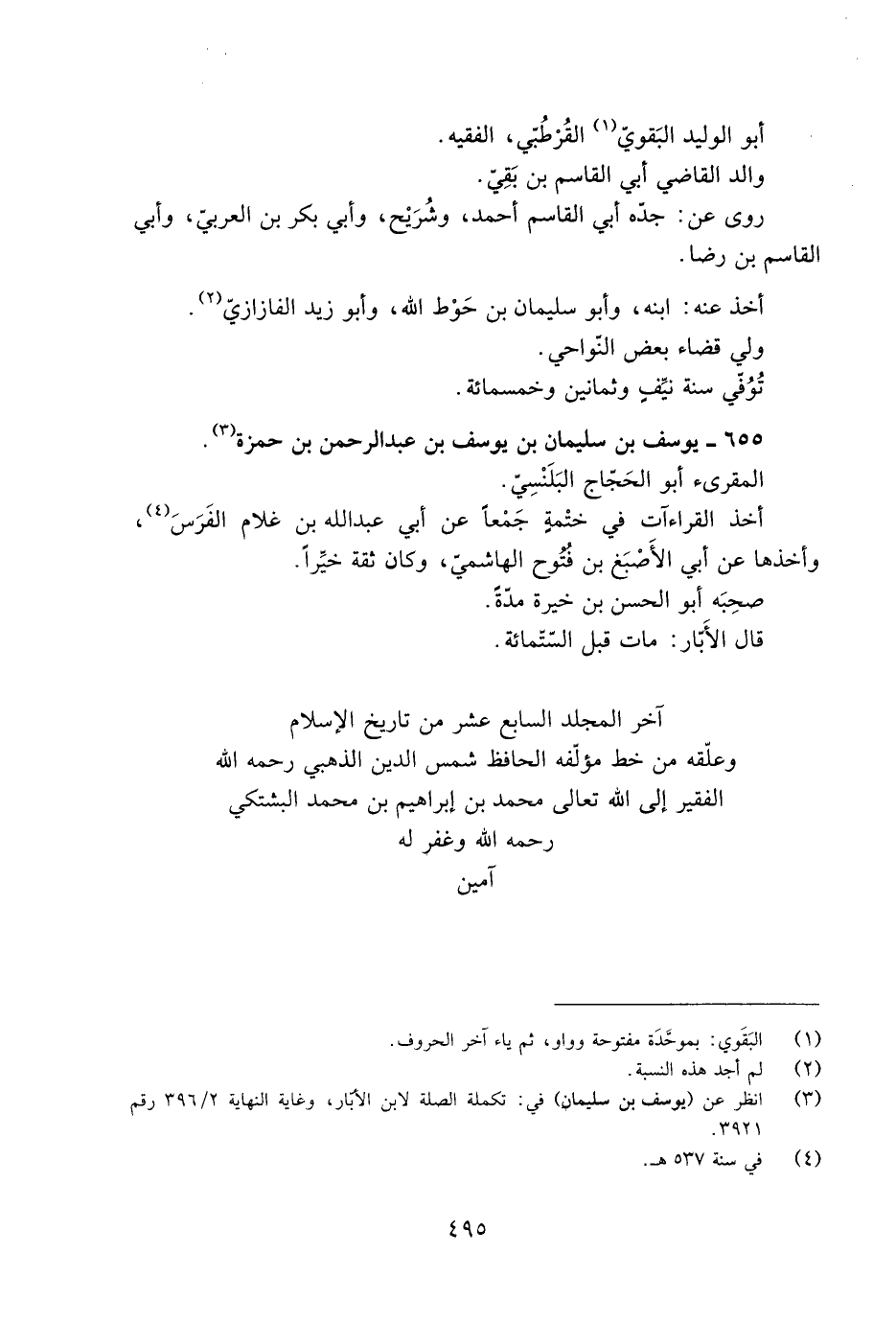 آخر المجلد السابع عشر من تاريخ الْإِسْلَام وعلّقه من خط مؤلّفه الحافظ شمس الدّين الذهبي رحمه اللَّه الفقير إِلَى اللَّه تعالى مُحَمَّد بْن إِبْرَاهِيم بْن مُحَمَّد البشتكي رحمه اللَّه وغفر له آمين