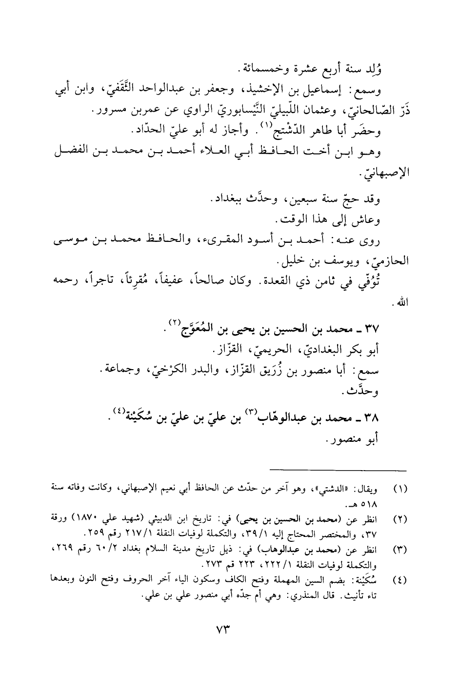 [3] انظر عن (محمد بن عبد الوهاب) في: ذيل تاريخ مدينة السلام بغداد 2/ 60 رقم 269، والتكملة لوفيات النقلة 1/ 222، 223 قم 273.