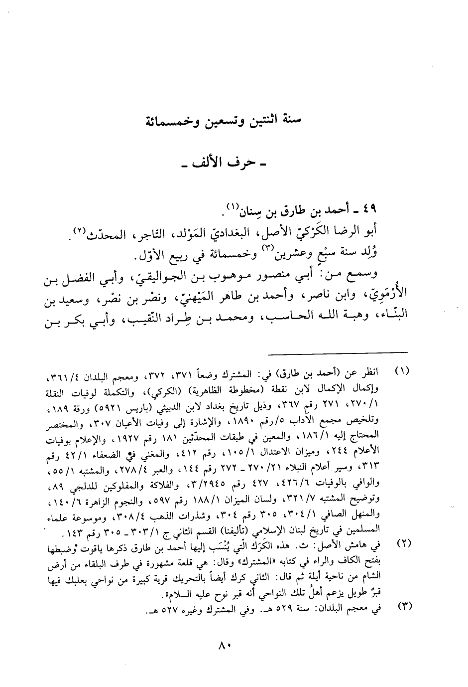 [1] انظر عن (أحمد بن طارق) في: المشترك وضعا 371، 372، ومعجم البلدان 4/ 361، وإكمال الإكمال لابن نقطة (مخطوطة الظاهرية) (الكركي) ، والتكملة لوفيات النقلة 1/ 270، 271 رقم 367، وذيل تاريخ بغداد لابن الدبيثي (باريس 5921) ورقة 189، وتلخيص مجمع الآداب 5/ رقم 1890، والإشارة إلى وفيات الأعيان 307، والمختصر المحتاج إليه 1/ 186، والمعين في طبقات المحدّثين 181 رقم 1927، والإعلام بوفيات الأعلام 244، وميزان الاعتدال 1/ 105، رقم 412، والمغني في الضعفاء 1/ 42 رقم 313، وسير أعلام النبلاء 21/ 270- 272 رقم 144، والعبر 4/ 278، والمشتبه 1/ 55، والوافي بالوفيات 6/ 426، 427 رقم 2945/ 3، والفلاكة والمفلوكين للدلجي 89، وتوضيح المشتبه 7/ 321، ولسان الميزان 1/ 188 رقم 597، والنجوم الزاهرة 6/ 140، والمنهل الصافي 1/ 304، 305 رقم 304، وشذرات الذهب 4/ 308، وموسوعة علماء المسلمين في تاريخ لبنان الإسلامي (تأليفنا) القسم الثاني ج 1/ 303- 305 رقم 143.