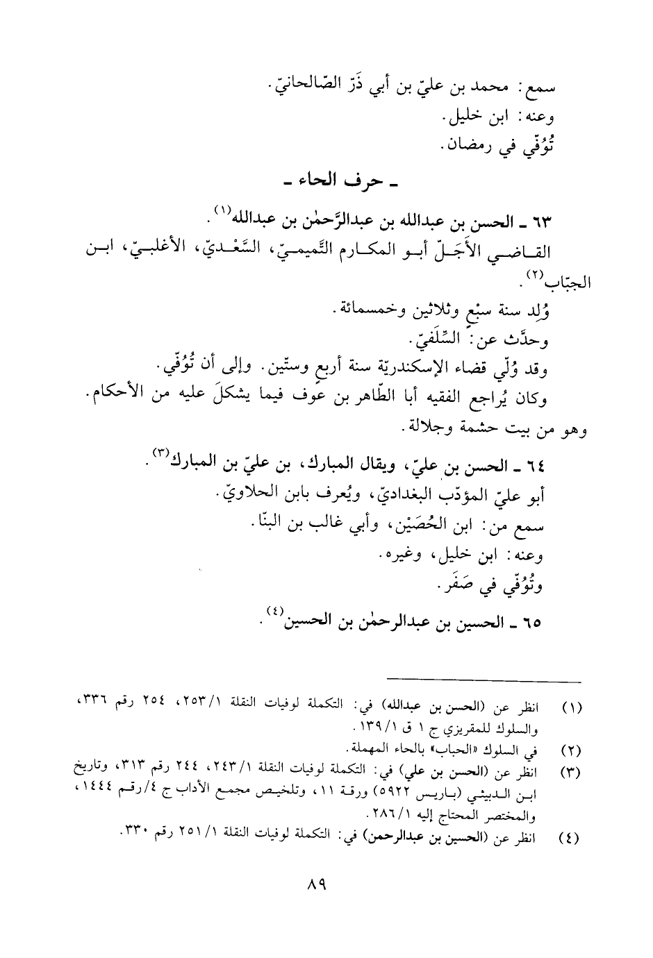 [1] انظر عن (الحسن بن عبد الله) في: التكملة لوفيات النقلة 1/ 253، 254 رقم 336، والسلوك للمقريزي ج 1 ق 1/ 139.