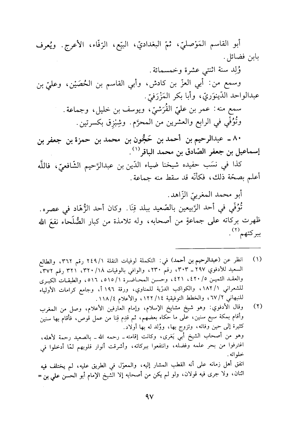 [1] انظر عن (عبد الرحيم بن أحمد) في: التكملة لوفيات النقلة 1/ 249 رقم 362، والطالع السعيد للأدفوي 297- 303، رقم 230، والوافي بالوفيات 18/ 320، 321 رقم 372، والعقد الثمين 5/ 420، 421، وحسن المحاضرة 1/ 515، 516، والطبقات الكبرى للشعراني 1/ 182، والكواكب الدرّية للمناوي، ورقة 196 أ، وجامع كرامات الأولياء للنبهاني 2/ 67، والخطط التوفيقية 14/ 122، والأعلام 4/ 118.