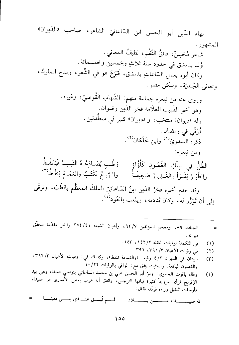 بهاء الدّين أبو الحسن ابن السّاعاتيّ الشاعر، صاحب «الدّيوان» المشهور.