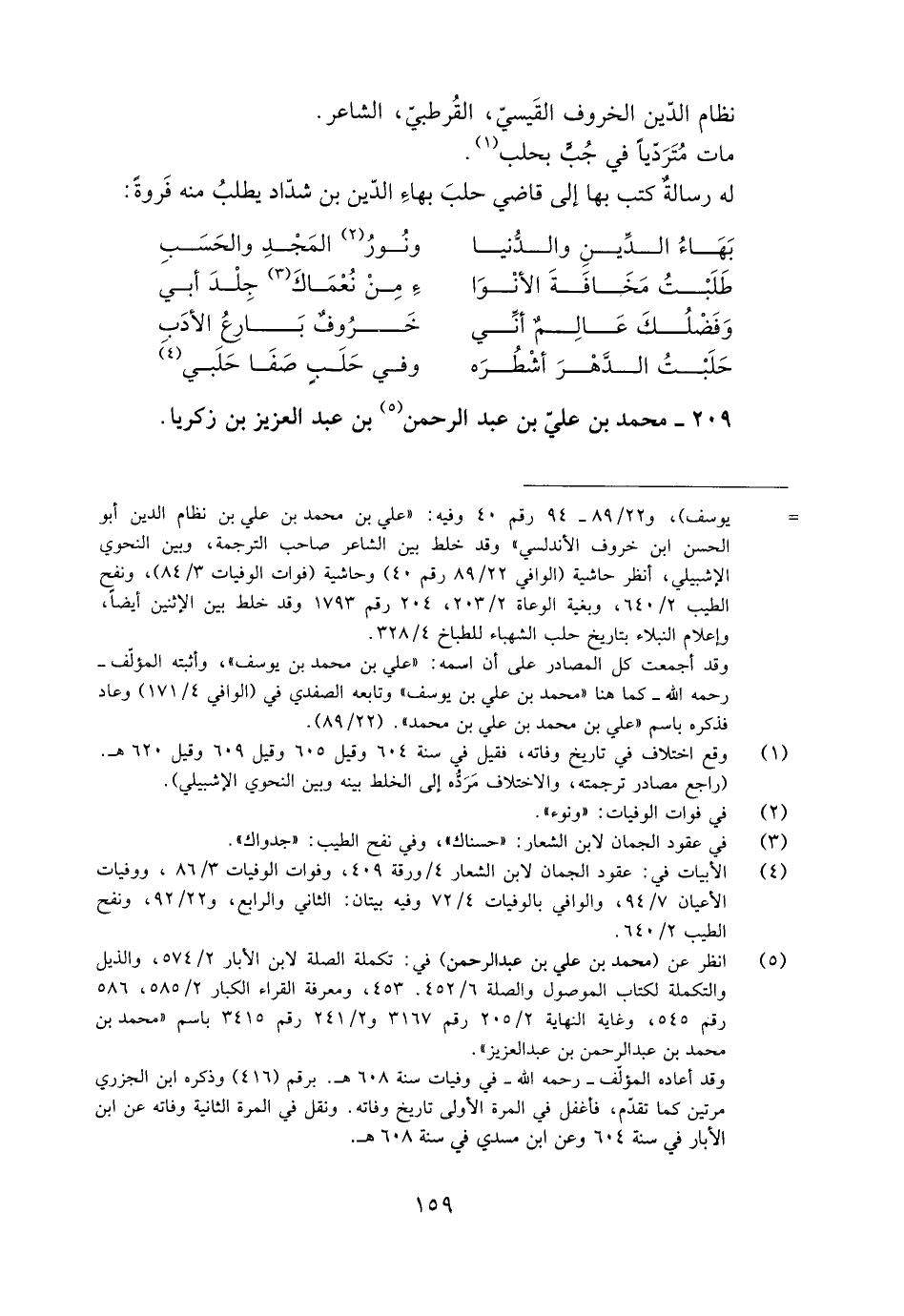 [ () ] يوسف) ، و 22/ 89- 94 رقم 40 وفيه: «علي بن محمد بن علي بن نظام الدين أبو الحسن ابن خروف الأندلسي» وقد خلط بين الشاعر صاحب الترجمة، وبين النحويّ الإشبيلي، انظر حاشية (الوافي 22/ 89 رقم 40) وحاشية (فوات الوفيات 3/ 84) ، ونفح الطيب 2/ 640، وبغية الوعاة 2/ 203، 204 رقم 1793 وقد خلط بين الاثنين أيضا، وإعلام النبلاء بتاريخ حلب الشهباء للطباخ 4/ 328.