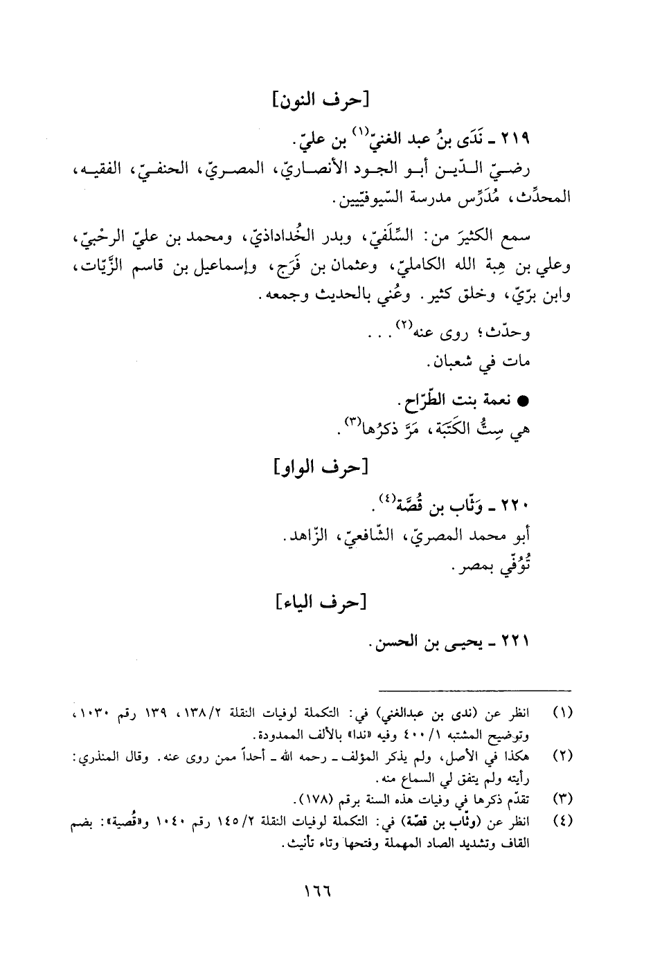 [1] انظر عن (ندي بن عبد الغني) في: التكملة لوفيات النقلة 2/ 138، 139 رقم 1030، وتوضيح المشتبه 1/ 400 وفيه «ندا» بالألف الممدودة.