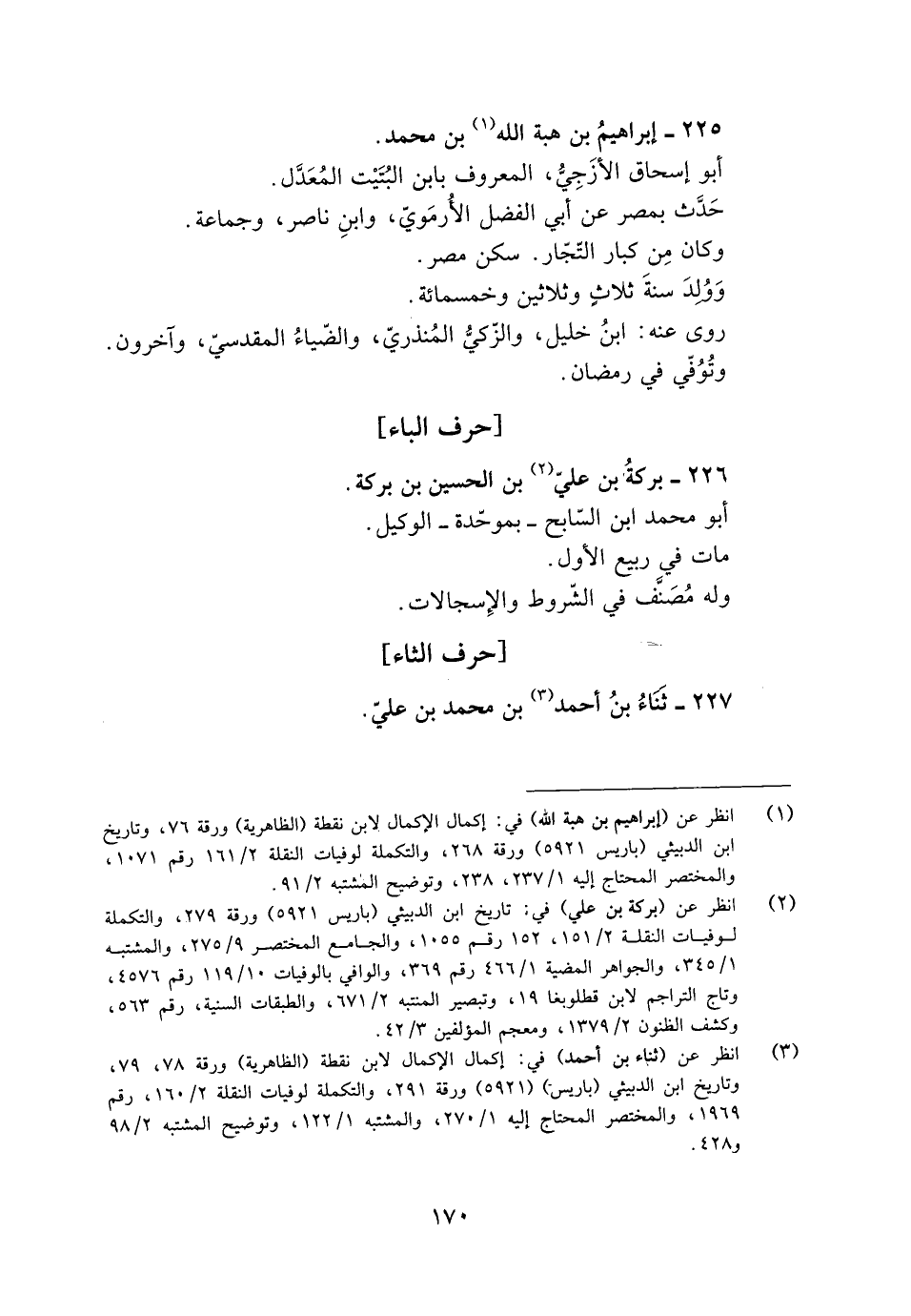 [1] انظر عن (إبراهيم بن هبة الله) في: إكمال الإكمال لابن نقطة (الظاهرية) ورقة 76، وتاريخ ابن الدبيثي (باريس 5921) ورقة 268، والتكملة لوفيات النقلة 2/ 161 رقم 1071، والمختصر المحتاج إليه 1/ 237، 238، وتوضيح المشتبه 2/ 91.