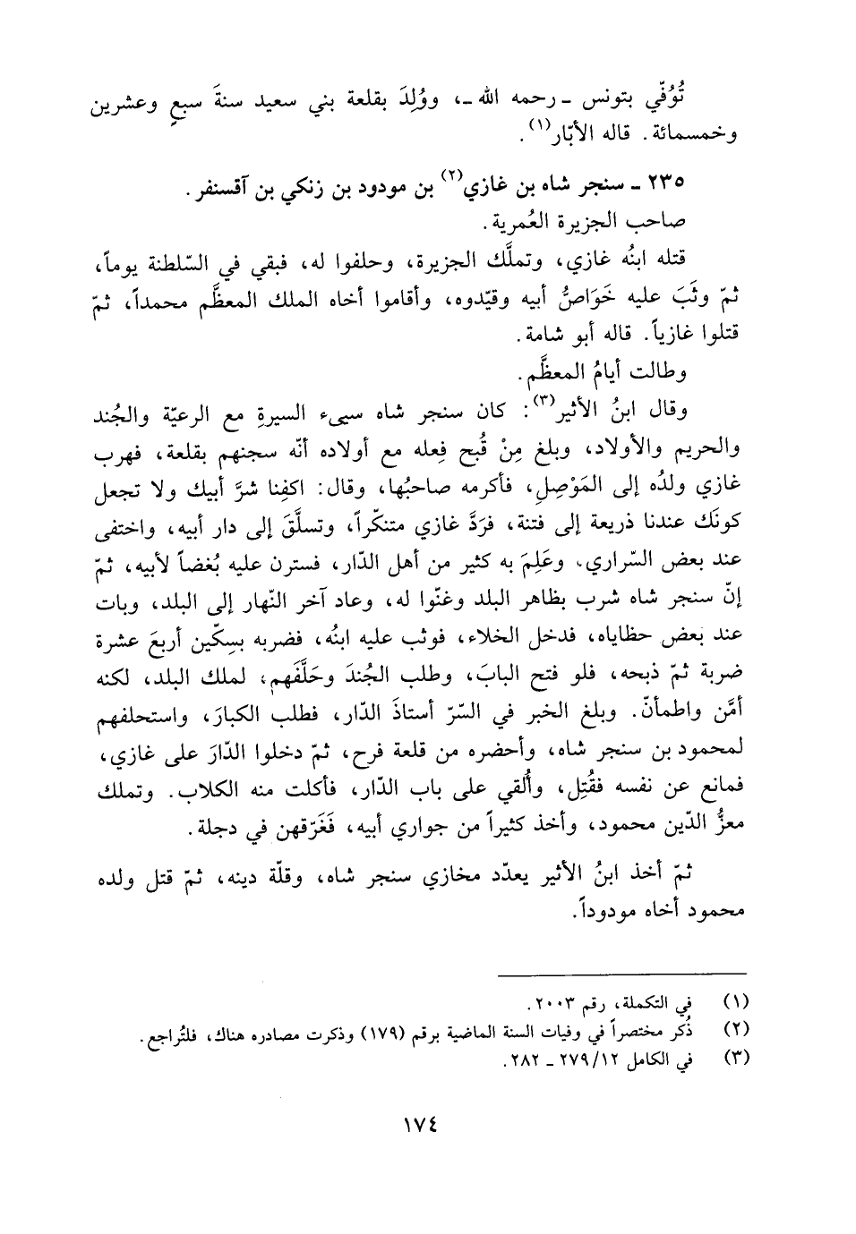 ثُمَّ أخذ ابنُ الأثير يعدّد مخازي سنجر شاه، وقلَّة دينه، ثمّ قتل ولده محمود أخاه مودودا.