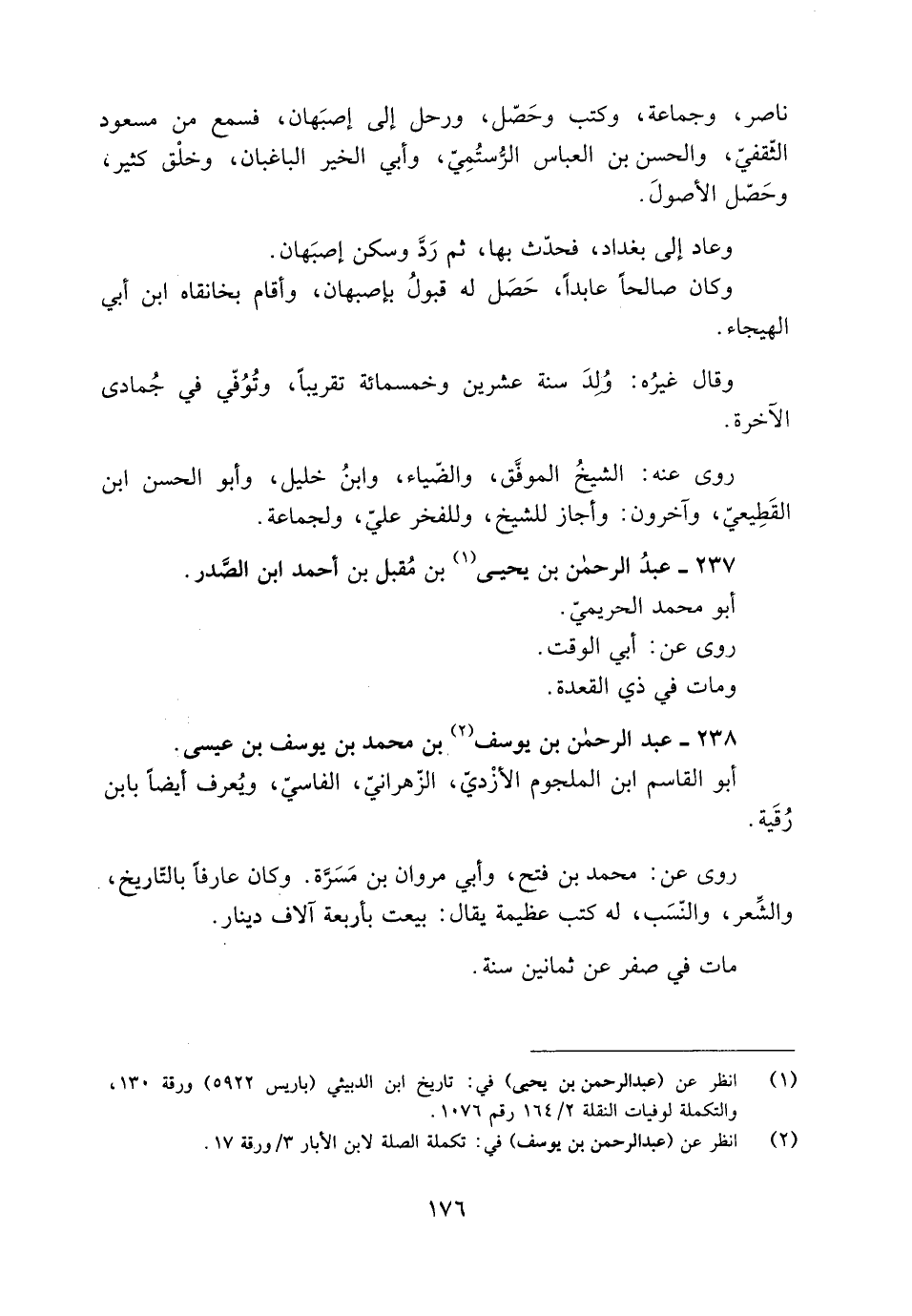 [1] انظر عن (عبد الرحمن بن يحيى) في: تاريخ ابن الدبيثي (باريس 5922) ورقة 130، والتكملة لوفيات النقلة 2/ 164 رقم 1076.