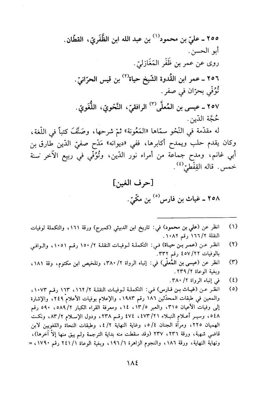 [5] انظر عن (غياث بن فارس) في: التكملة لوفيات النقلة 2/ 162، 163 رقم 1073، والمعين في طبقات المحدّثين 186 رقم 1983، والإعلام بوفيات الأعلام 249، والإشارة إلى وفيات الأعيان 315، والعبر 5/ 13، 14، ومعرفة القراء الكبار 2/ 589، 590 رقم 548، وسير أعلام النبلاء 21/ 473، 474 رقم 238، ودول الإسلام 2/ 83، ونكت الهيمان 225، ومرآة الجنان 4/ 5، وغاية النهاية 2/ 4، وطبقات النحاة واللغويين لابن قاضي شهبة، ورقة 236، 237 (وقد سقطت منه بداية الترجمة ولم يبق منها إلّا آخرها) ، ونهاية النهاية، ورقة 186، والنجوم الزاهرة 6/ 196، وبغية الوعاة 1/ 241 رقم 1790، وحسن المحاضرة 1/ 237، وشذرات الذهب 5/ 17، وديوان الإسلام 2/ 70 رقم 655.