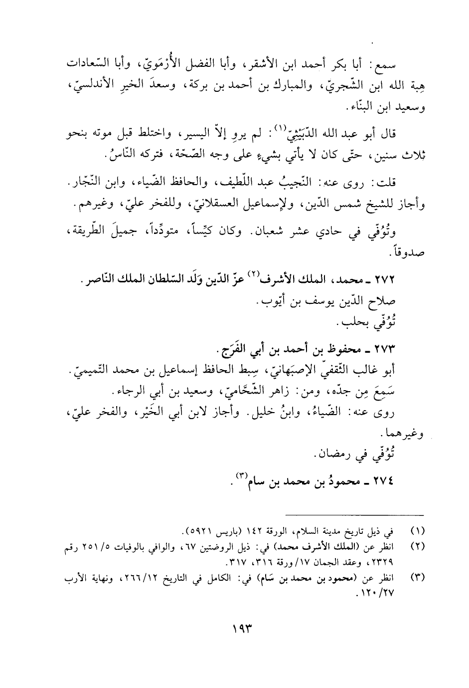 [2] انظر عن (الملك الأشرف محمد) في: ذيل الروضتين 67، والوافي بالوفيات 5/ 251 رقم 2329، وعقد الجمان 17/ ورقة 316، 317.