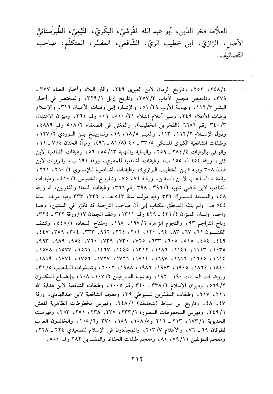 [4] / 248، 252، وتاريخ الزمان لابن العبري 249، وآثار البلاد وأخبار العباد 377- 379، وتلخيص مجمع الآداب 3/ 357، وتاريخ إربل 1/ 329، والمختصر في أخبار البشر 3/ 112، ونهاية الأرب 29/ 51، والإشارة إلى وفيات الأعيان 316، والإعلام بوفيات الأعلام 249، وسير أعلام النبلاء 21/ 500، 501 رقم 261، وميزان الاعتدال 3/ 340 رقم 6686 (الفخر بن الخطيب) ، والمغني في الضعفاء 2/ 508 رقم 4889، ودول الإسلام 2/ 112، 113، والعبر 5/ 18، 19، وتاريخ ابن الوردي 2/ 127، وطبقات الشافعية الكبرى للسبكي 5/ 33- 40 (8/ 81- 96) ، ومرآة الجنان 4/ 7- 11، والوافي بالوفيات 4/ 284- 259، والبداية والنهاية 13/ 55، 56، وطبقات الشافعية لابن كثير، ورقة 154 أ، 155 ب، وطبقات الشافعية للمطري، ورقة 194 ب، والوفيات لابن قنفذ 308 وفيه «ابن الخطيب الرازيّ» ، وطبقات الشافعية للإسنويّ 2/ 260، 261، والعقد المذهب لابن الملقن، ورقة 74، 75، وتاريخ الخميس 2/ 410، وطبقات الشافعية لابن قاضي شهبة 2/ 396- 398 رقم 366، وطبقات النحاة واللغويين، له ورقة 48، والعسجد المسبوك 332 وفيه مولده سنة 543 هـ.، 332، 333 وفيه مولده سنة 544 هـ. ولم يتنبّه المحقّق للكتاب إلى أن صاحب الترجمة قد تكرّر في السنتين، وهما واحد، ولسان الميزان 4/ 426- 429 رقم 1311، وعقد الجمان 17/ ورقة 322- 324، وتاج التراجم 93، والنجوم الزاهرة 6/ 197، 198، مفتاح السعادة 1/ 445، وكشف الظنون 61، 67، 83، 94، 120، 204، 224، 962، 333، 354، 359، 447، 449، 454، 515، 605، 633، 725، 730، 739، 760، 954، 989، 993، 1035، 1113، 1141، 1186، 1312، 1445، 1467، 1561، 1577، 1578، 1614، 1615، 1616، 1697، 1714، 1726، 1727، 1756، 1774، 1819، 1840، 1864، 1905، 1973، 1986، 1988، 2002، وشذرات الذهب 5/ 31، وروضات الجنات 190- 192، وهدية العارفين 2/ 107، 108، وإيضاح المكنون 2/ 569، وديوان الإسلام 2/ 338- 340 رقم 1005، وطبقات الشافعية لابن هداية الله 216، 217، وطبقات المفسّرين للسيوطي 39، ومعجم الشافعية لابن عبد الهادي، ورقة 47، 48، وتاريخ ابن سباط (بتحقيقنا) 1/ 248، وفهرس مخطوطات الظاهرية للعش 6/ 249، وفهرس المخطوطات المصورة 1/ 233، 237، 238، 251، 253، وفهرست الخديوية 1/ 173، 213- 216 و 5/ 158، 159، 370 و 6/ 105، والخالدون العرب لطوقان 69- 76، والأعلام 7/ 203، والمجدّدون في الإسلام للصعيدي 224- 228، ومعجم المؤلفين 11/ 79، 80، ومعجم طبقات الحفاظ والمفسرين 282 رقم 550.