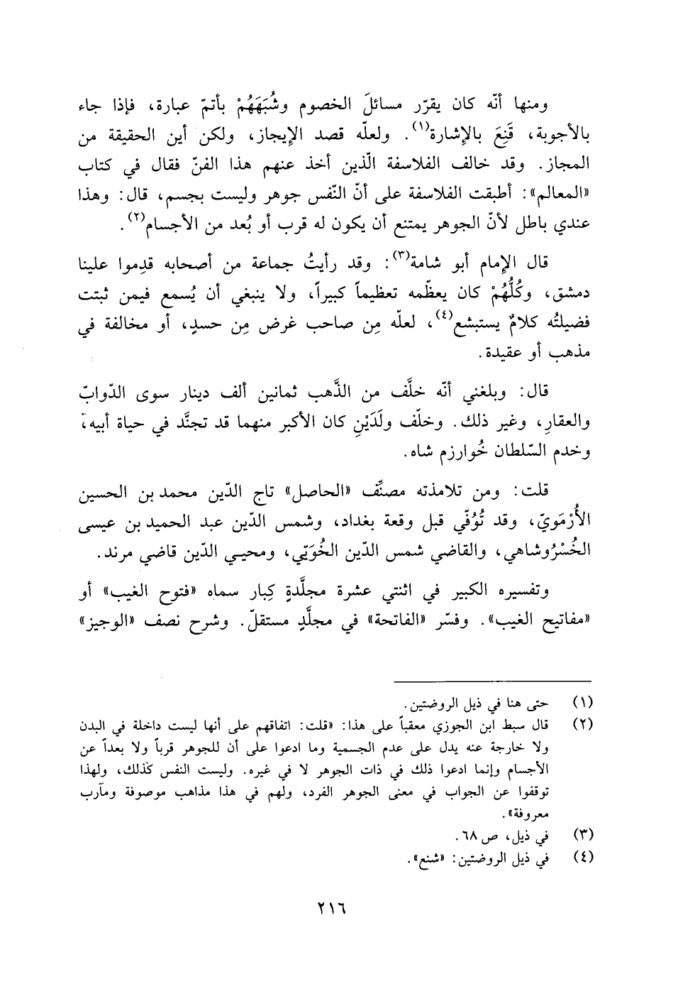 ومنها أَنَّهُ كَانَ يقرّر مسائلَ الخصوم وشُبَهَهُمْ بأتمّ عبارة، فإذا جاء بالأجوبة، قَنِعَ بالإِشارة [1] . ولعلّه قصد الإِيجاز، ولكن أين الحقيقة من المجاز. وقد خالف الفلاسفة الّذين أخذ عنهم هذا الفنّ فَقَالَ في كتاب «المعالم» : أطبقت الفلاسفة عَلَى أنّ النّفس جوهر وليست بجسم، قَالَ: وهذا عندي باطل لأنّ الجوهر يمتنع أن يكون لَهُ قرب أو بُعد من الأجسام [2] .