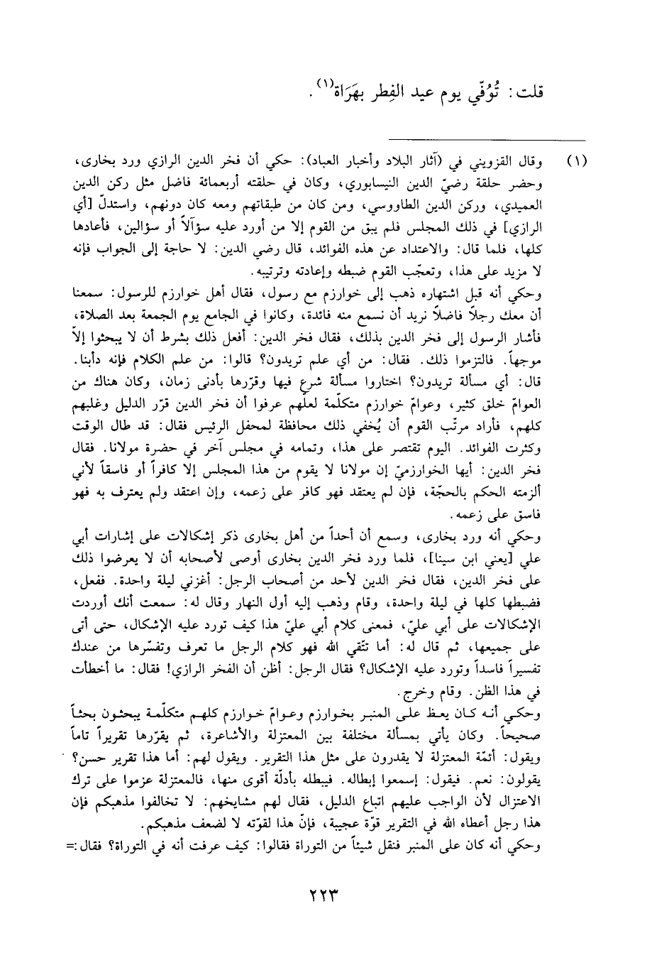 قال: أي مسألة تريدون؟ اختاروا مسألة شرع فيها وقرّرها بأدنى زمان، وكان هناك من العوامّ خلق كثير، وعوامّ خوارزم متكلّمة لعلّهم عرفوا أن فخر الدين قرّر الدليل وغلبهم كلهم، فأراد مرتّب القوم أن يخفي ذلك محافظة لمحفل الرئيس فقال: قد طال الوقت وكثرت الفوائد. اليوم تقتصر على هذا، وتمامه في مجلس آخر في حضرة مولانا. فقال فخر الدين: أيها الخوارزميّ إن مولانا لا يقوم من هذا المجلس إلا كافرا أو فاسقا لأني ألزمته الحكم بالحجّة، فإن لم يعتقد فهو كافر على زعمه، وإن اعتقد ولم يعترف به فهو فاسق على زعمه.