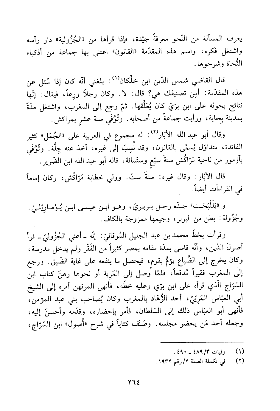 وقال أبو عَبْد الله الأبّار [2] : لَهُ مجموع في العربية عَلَى «الْجُمَل» كثير الفائدة، متداوَل يُسمَّى بالقانون، وقد نُسِبَ إِلى غيره، أخذ عَنْهُ جِلَّة. وتُوُفّي بآزمور من ناحية مَرّاكُش سنةَ سبع وستّمائة، قاله أبو عبد الله ابن الضّرير.