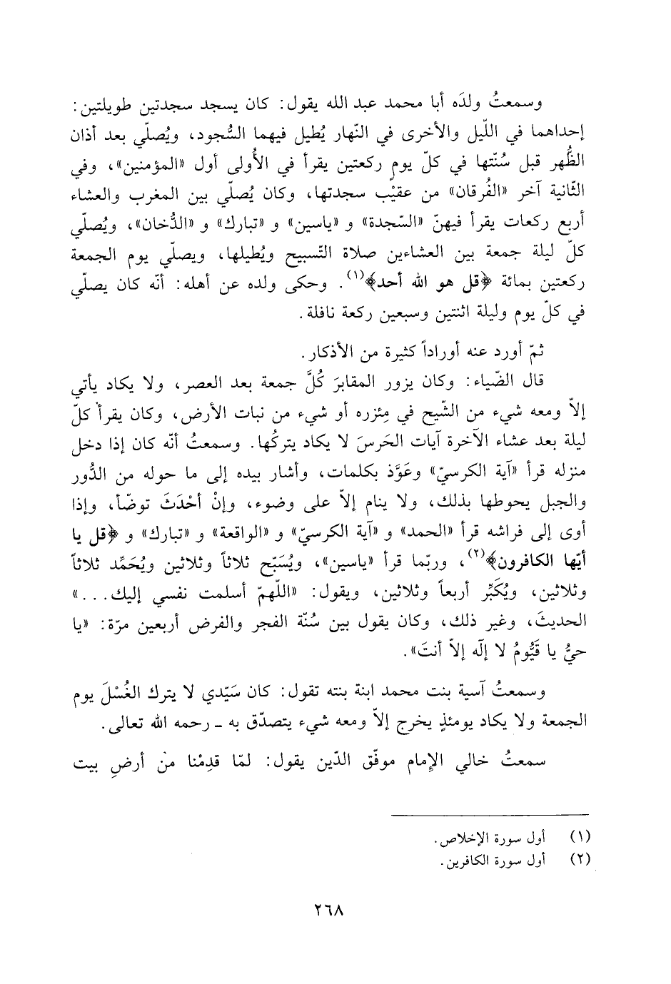 إحداهما في اللّيل والأخرى في النّهار يُطيل فيهما السُّجود، ويُصلّي بعد أذان الظُّهر قبل سُنّتها في كلّ يومٍ ركعتين يقرأ في الأولى أول «المؤمنين» ، وفي الثّانية آخر «الفُرقان» من عقيْب سجدتها، وكان يُصلّي بين المغرب والعشاء أربع ركعات يقرأ فيهنّ «السّجدة» و «ياسين» و «تبارك» و «الدّخان» ، ويُصلّي كلّ ليلة جمعة بين العشاءين صلاة التّسبيح ويُطيلها، ويصلّي يوم الجمعة ركعتين بمائة قُلْ هُوَ الله أَحَدٌ 112: 1 [1] . وحكى ولده عَنْ أهله: أَنَّهُ كَانَ يُصلّي في كلّ يوم وليلة اثنتين وسبعين ركعة نافلة.