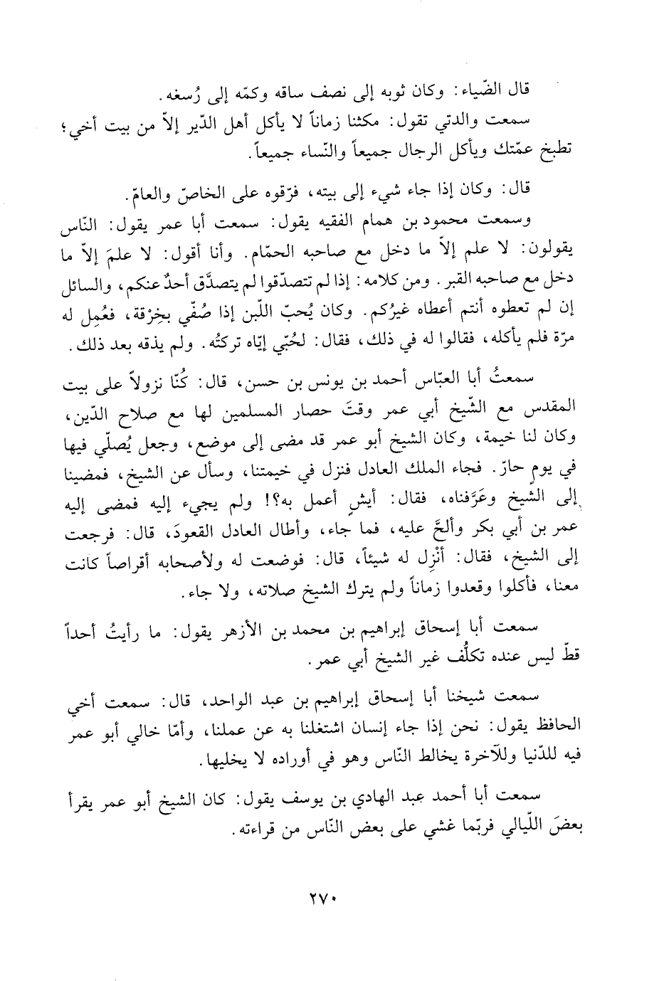 سَمِعْتُ أبا العَبَّاس أَحْمَد بْن يونس بْن حسن، قَالَ: كُنّا نزولا عَلَى بيت المقدس مَعَ الشّيخ أَبِي عُمَر وقتَ حصار المسلمين لها مَعَ صلاح الدّين، وكان لنا خيمة، وكان الشيخ أَبُو عُمَر قد مضى إِلى موضع، وجعل يُصلّي فيها في يومٍ حارّ. فجاء المَلِك العادل فنزل في خيمتنا، وسأل عَنِ الشيخ، فمضينا إِلى الشيخ وعَرَّفناه، فَقَالَ: أيشٍ أعمل بِهِ؟! ولم يجيء إِلَيْهِ فمضى إِلَيْهِ عُمَر بْن أَبِي بَكْر وألحَّ عَلَيْهِ، فَما جاء، وأطال العادل القعودَ، قَالَ: فرجعت إِلى الشيخ، فَقَالَ: أنْزَل لَهُ شيئا، قَالَ: فوضعت لَهُ ولأصحابه أقراصا كانت معنا، فأكلوا وقعدوا زمانا ولم يترك الشيخ صلاته، ولا جاء.