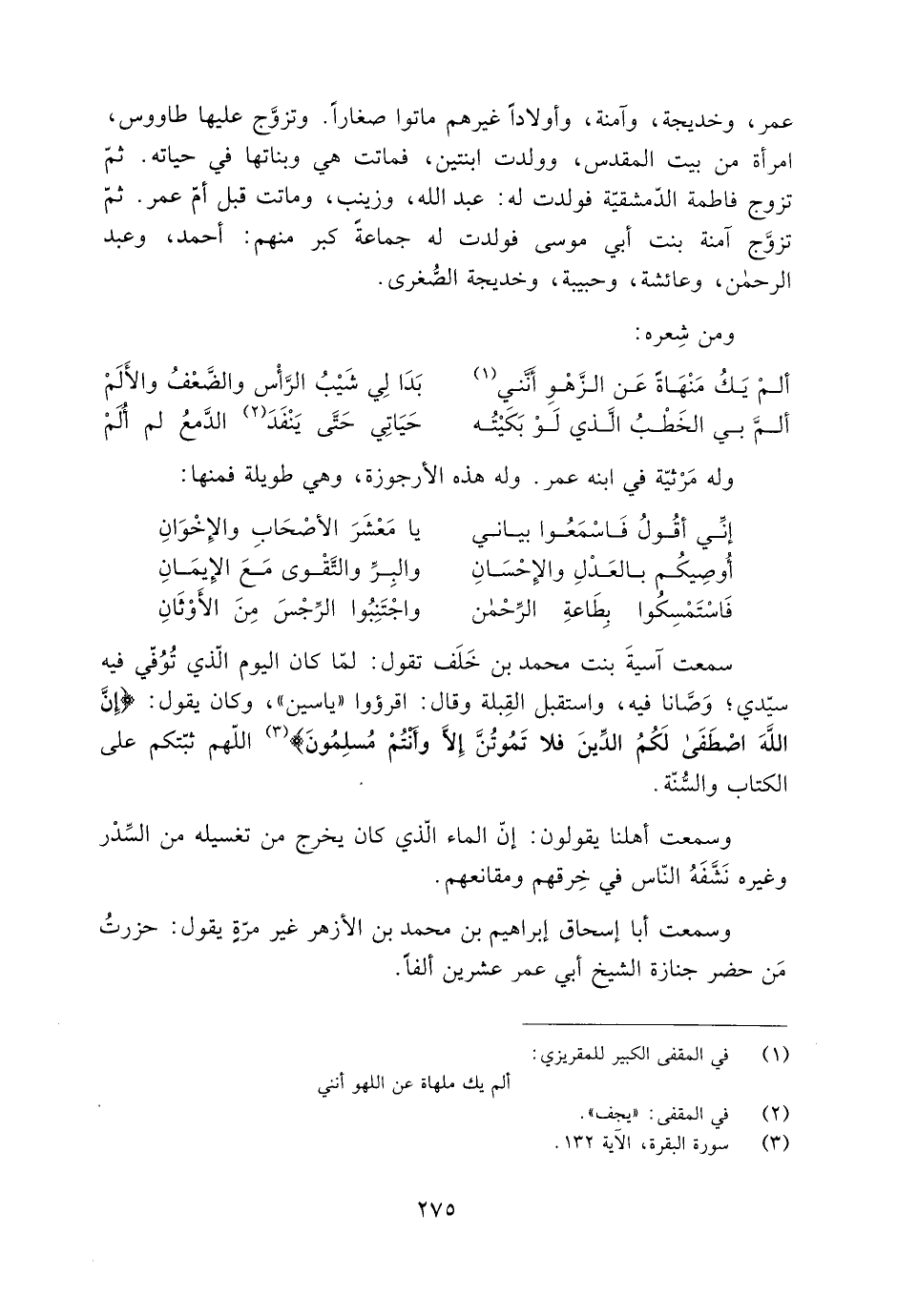 سَمِعْتُ آسيةَ بنت مُحَمَّد بْن خَلَف تَقُولُ: لمّا كَانَ اليوم الّذي تُوُفّي فيه سيّدي، وَصَّانا فيه، واستقبل القِبلة وقال: اقرءوا «ياسين» ، وكان يَقُولُ: إِنَّ اللَّهَ اصْطَفى لَكُمُ الدِّينَ فَلا تَمُوتُنَّ إِلَّا وَأَنْتُمْ مُسْلِمُونَ 2: 132 [3] اللَّهمّ ثبّتكم عَلَى الكتاب والسُّنَّة.
