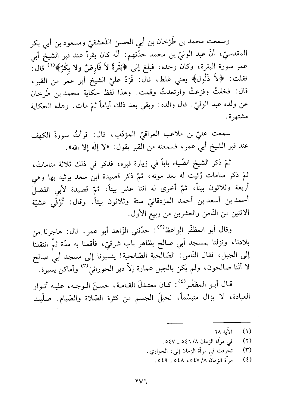 وسمعت مُحَمَّد بْن طَرْخان بْن أَبِي الحَسَن الدّمشقيّ ومسعود بْن أَبِي بَكْر المقدسيّ، أنّ عَبْد الوليّ بْن مُحَمَّد حدّثهم: أَنَّهُ كَانَ يقرأ عند قبر الشيخ أبي عمر سورة البقرة، وكان وحده، فبلغ إلى بَقَرَةٌ لا فارِضٌ وَلا بِكْرٌ 2: 68 [1] قال: