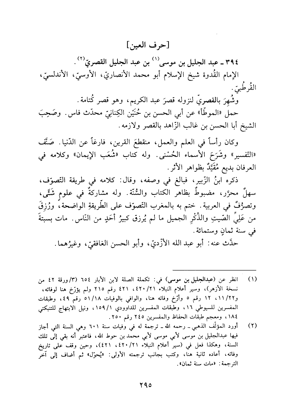 [1] انظر عن (عبد الجليل بن موسى) في: تكملة الصلة لابن الأبار 654 (3/ ورقة 42 من نسخة الأزهر) ، وسير أعلام النبلاء 21/ 420، 421 رقم 215 ولم يؤرّخ هنا لوفاته، و 22/ 11، 12 رقم 5 وأرّخ وفاته هنا، والوافي بالوفيات 18/ 51 رقم 49، وطبقات المفسرين للسيوطي 16، وطبقات المفسرين للداوديّ 1/ 159، ونيل الابتهاج للتنبكتي 184، ومعجم طبقات الحفاظ والمفسرين 245 رقم 250.