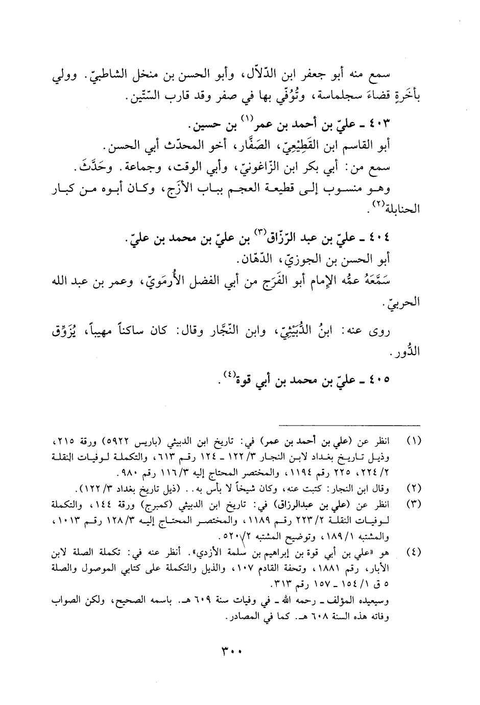[3] انظر عن (علي بن عبد الرزاق) في: تاريخ ابن الدبيثي (كمبرج) ورقة 144، والتكملة لوفيات النقلة 2/ 223 رقم 1189، والمختصر المحتاج إليه 3/ 128 رقم 1013، والمشتبه 1/ 189، وتوضيح المشتبه 2/ 520.