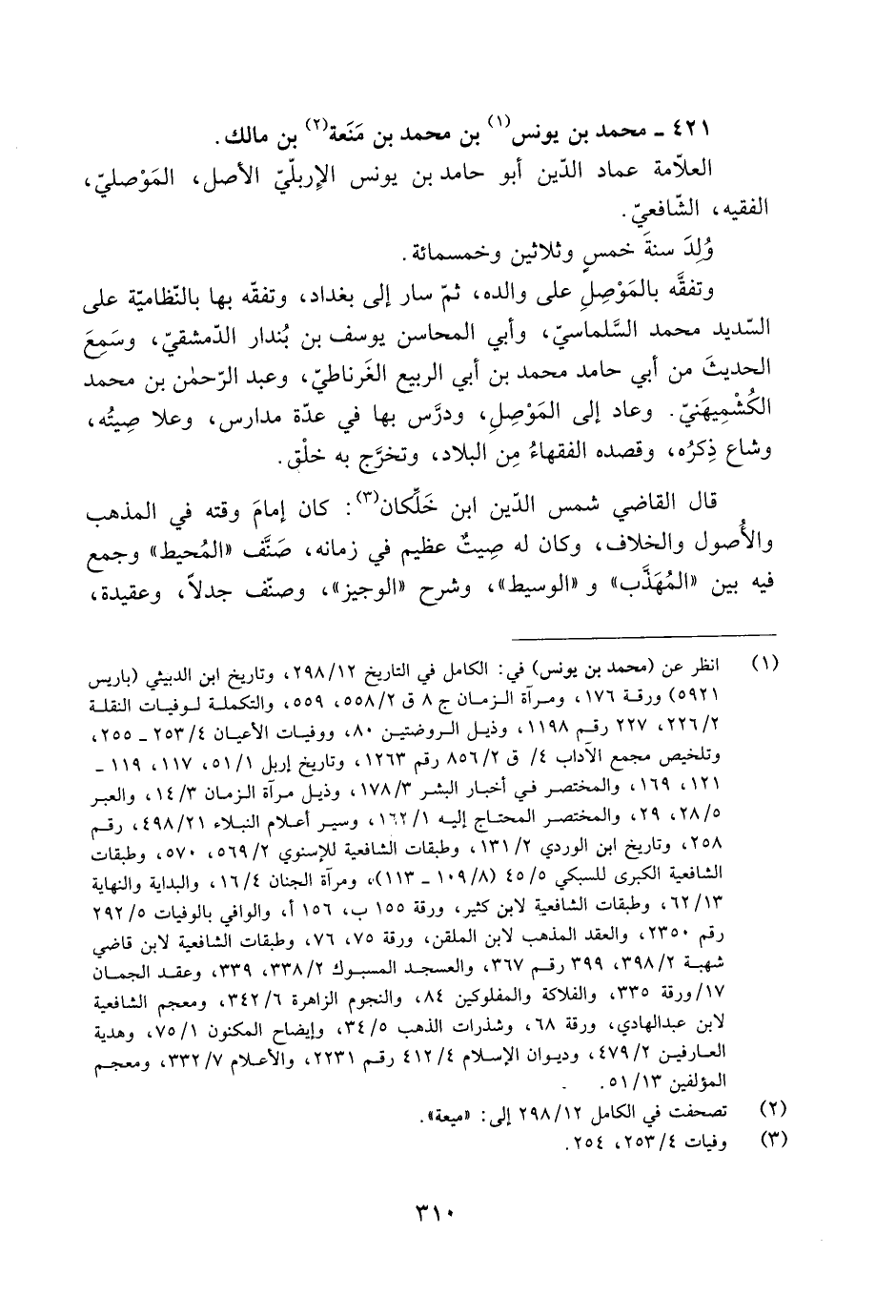 [1] انظر عن (محمد بن يونس) في: الكامل في التاريخ 12/ 298، وتاريخ ابن الدبيثي (باريس 5921) ورقة 176، ومرآة الزمان ج 8 ق 2/ 558، 559، والتكملة لوفيات النقلة 2/ 226، 227 رقم 1198، وذيل الروضتين 80، ووفيات الأعيان 4/ 253- 255، وتلخيص مجمع الآداب 4/ ق 2/ 856 رقم 1263، وتاريخ إربل 1/ 51، 117، 119- 121، 169، والمختصر في أخبار البشر 3/ 178، وذيل مرآة الزمان 3/ 14، والعبر 5/ 28، 29، والمختصر المحتاج إليه 1/ 162، وسير أعلام النبلاء 21/ 498، رقم 258، وتاريخ ابن الوردي 2/ 131، وطبقات الشافعية للإسنويّ 2/ 569، 570، وطبقات الشافعية الكبرى للسبكي 5/ 45 (8/ 109- 113) ، ومرآة الجنان 4/ 16، والبداية والنهاية 13/ 62، وطبقات الشافعية لابن كثير، ورقة 155 ب، 156 أ، والوافي بالوفيات 5/ 292 رقم 2350، والعقد المذهب لابن الملقن، ورقة 75، 76، وطبقات الشافعية لابن قاضي شهبة 2/ 398، 399 رقم 367، والعسجد المسبوك 2/ 338، 339، وعقد الجمان 17/ ورقة 335، والفلاكة والمفلوكين 84، والنجوم الزاهرة 6/ 342، ومعجم الشافعية لابن عبد الهادي، ورقة 68، وشذرات الذهب 5/ 34، وإيضاح المكنون 1/ 75، وهدية العارفين 2/ 479، وديوان الإسلام 4/ 412 رقم 2231، والأعلام 7/ 332، ومعجم المؤلفين 13/ 51.