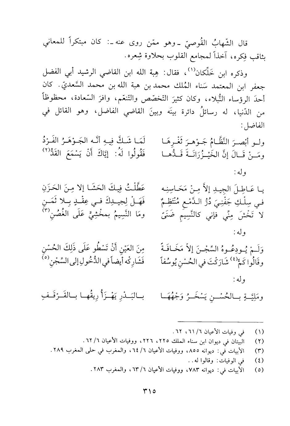 [2] البيتان في ديوان ابن سناء الملك 225، 226 ووفيات الأعيان 6/ 62.