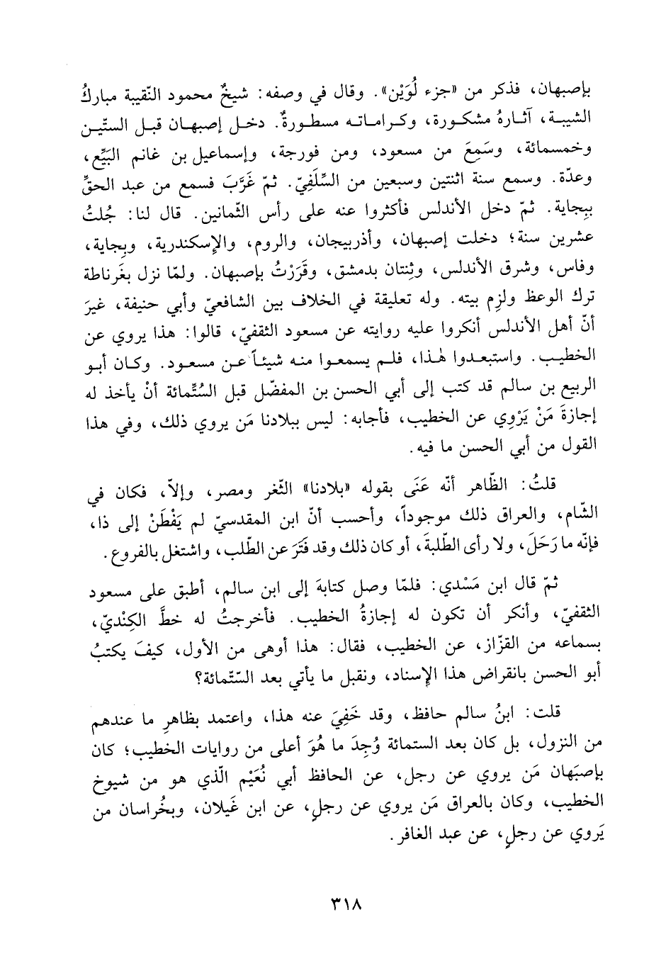 بأصبهان، فذكر من «جزء لُوَيْن» . وقال في وصفه: شيخٌ محمود النّقيبة مباركُ الشيبة، آثارهُ مشكورة، وكراماته مسطورةٌ. دخل أصبهان قبل الستّين وخمسمائة، وسَمِعَ من مسعود، ومن فورجة، وإسماعيل بْن غانم البَيِّع، وعدَّة. وسَمِعَ سنة اثنتين وسبعين من السِّلَفِيّ. ثُمَّ غَرَّبَ فسمع من عَبْد الحقِّ ببِجاية. ثُمَّ دخل الأندلس فأكثروا عَنه عَلَى رأس الثّمانين. قَالَ لنا: جُلتُ عشرين سنة، دخلت أصبهان، وأذربيجان، والروم، والإسكندرية، وبِجاية، وفاس، وشرق الأندلس، وثِنتان بدمشق، وقَرَرْتُ بأصبهان. ولمّا نزل بغَرناطة ترك الوعظ ولزِم بيته. وله تعليقة في الخلاف بين الشافعيّ وأبي حنيفة، غيرَ أنّ أهل الأندلس أنكروا عَلَيْهِ روايته عَنْ مسعود الثقفيّ، قَالُوا: هذا يروي عَنِ الخطيب. واستبعدوا هذا، فلم يسمعوا منه شيئا عَنْ مسعود. وكان أَبُو الربيع بْن سالم قد كتب إِلى أَبِي الحَسَن بْن المفضّل قبل السُتِّمائة أنْ يأخذ لَهُ إجازةَ مَنْ يَرْوِي عَنِ الخطيب، فأجابه: لَيْسَ ببلادنا مَن يروي ذَلِكَ، وفي هذا القول من أَبِي الحَسَن ما فيه.