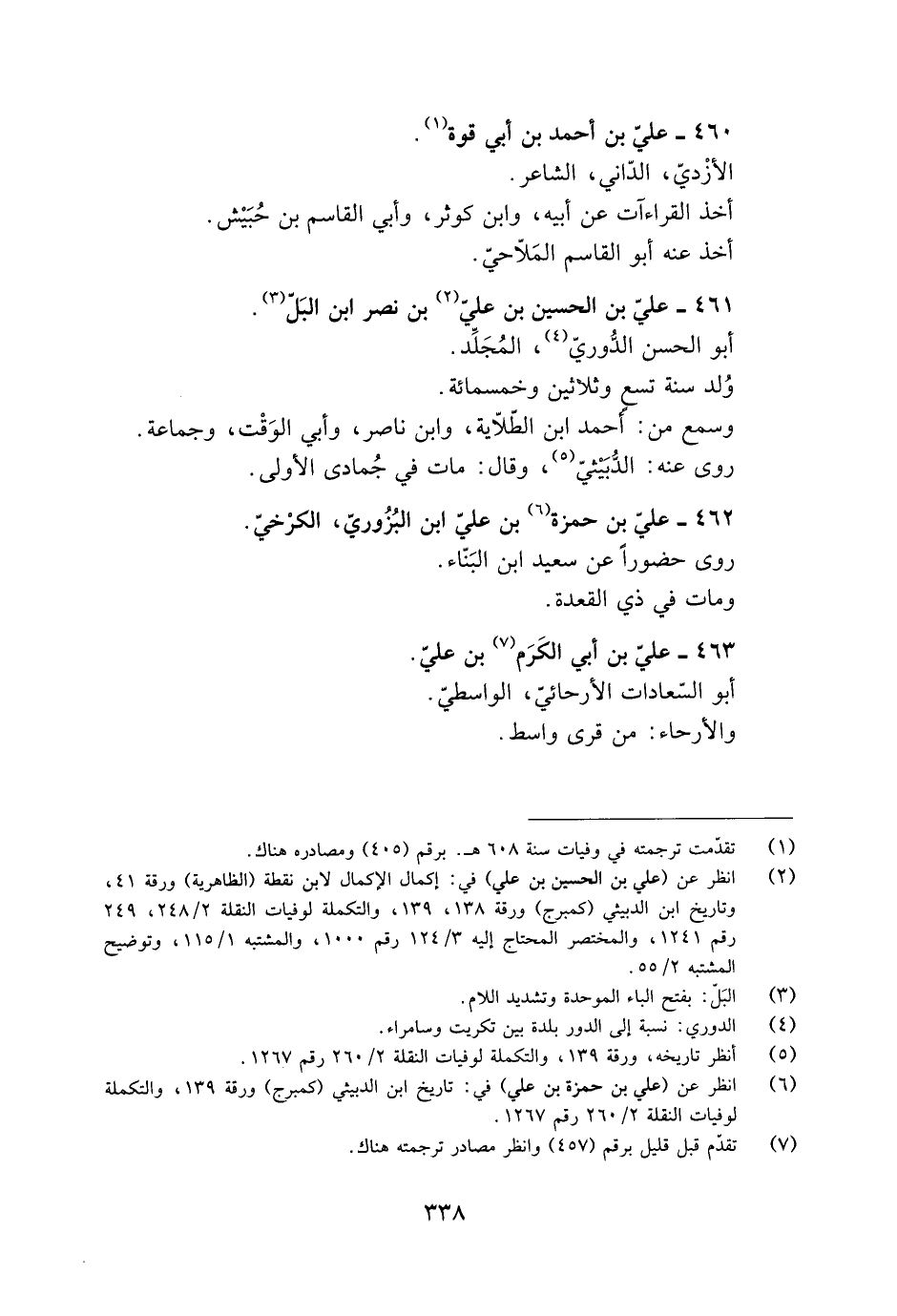 [6] انظر عن (علي بن حمزة بن علي) في: تاريخ ابن الدبيثي (كمبرج) ورقة 139، والتكملة لوفيات النقلة 2/ 260 رقم 1267.