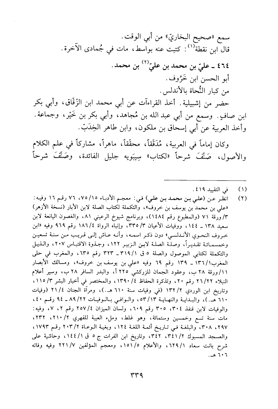 «علي بن محمد بن يوسف بن خروف» ، والتكملة لكتاب الصلة لابن الأبار (نسخة الأزهر) 3/ ورقة 71 (والمطبوع رقم 1484) ، وبرنامج شيوخ الرعينيّ 81، والغصون اليانعة لابن سعيد 138- 144، ووفيات الأعيان 3/ 335، وإنباه الرواة 4/ 186 رقم 969 وفيه «ابن خروف النحويّ الأندلسي» دون ذكر اسمه، وأنه عاش إلى قريب من سنة تسعين وخمسمائة تقديرا، وصلة الصلة لابن الزبير 122، وجذوة الاقتباس 207، والذيل والتكملة لكتابي الموصول والصلة 5 ق 1/ 319- 323 رقم 635، والمغرب في حلى المغرب 1/ 136- 139 رقم 69 وفيه «علي بن يوسف بن خروف» ، ومسالك الأبصار 11/ ورقة 28 ب، وعقود الجمان للزركشي 225 أ، والبدر السافر 28 ب، وسير أعلام النبلاء 22/ 26 رقم 20، وتذكرة الحفاظ 4/ 1390، والمختصر في أخبار البشر 3/ 115، وتاريخ ابن الوردي 2/ 132 (في وفيات سنة 610 هـ.) ، ومرآة الجنان 4/ 21 (وفيات 610 هـ.) ، والبداية والنهاية 13/ 53، والوافي بالوفيات 22/ 89- 94 رقم 40، والوفيات لابن قنفذ 304، 305 رقم 609، ولسان الميزان 4/ 257 رقم 2، 7، وفيه: