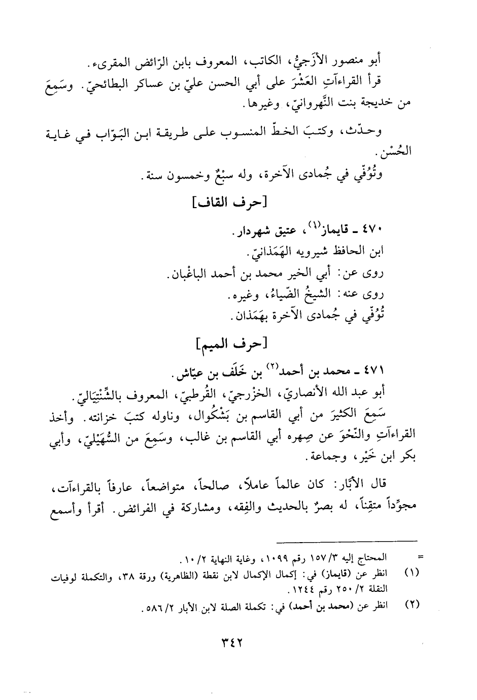 [1] انظر عن (قايماز) في: إكمال الإكمال لابن نقطة (الظاهرية) ورقة 38، والتكملة لوفيات النقلة 2/ 250 رقم 1244.