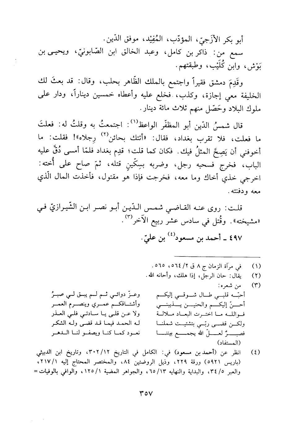 [4] انظر عن (أحمد بن مسعود) في: الكامل في التاريخ 12/ 302، وتاريخ ابن الدبيثي (باريس 5921) ورقة 229، وذيل الروضتين 84، والمختصر المحتاج إليه 1/ 217، والعبر 5/ 34، والبداية والنهاية 13/ 65، والجواهر المضية 1/ 125، والوافي بالوفيات