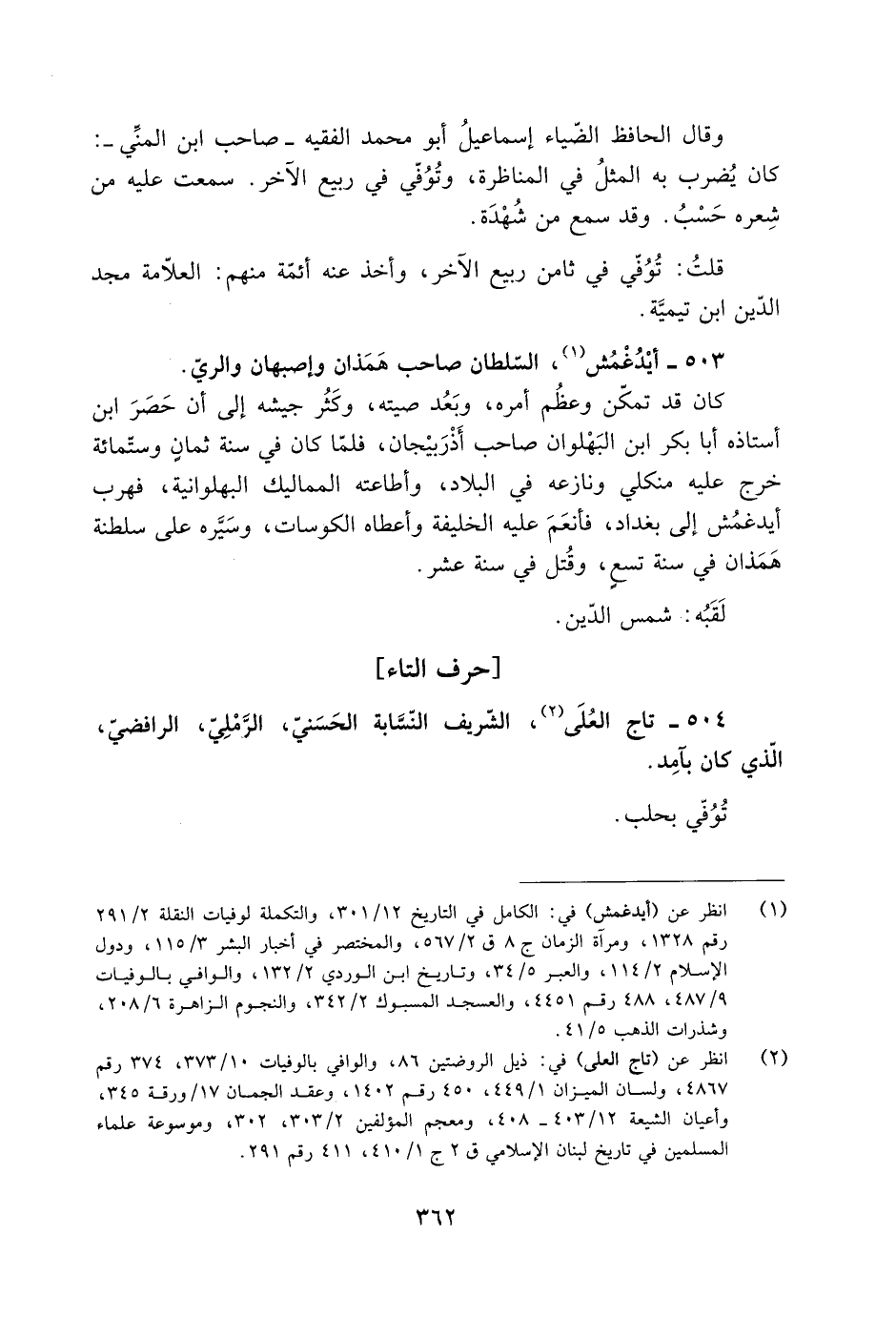 [2] انظر عن (تاج العلى) في: ذيل الروضتين 86، والوافي بالوفيات 10/ 373، 374 رقم 4867، ولسان الميزان 1/ 449، 450 رقم 1402، وعقد الجمان 17/ ورقة 345، وأعيان الشيعة 12/ 403- 408، ومعجم المؤلفين 2/ 303، 302، وموسوعة علماء المسلمين في تاريخ لبنان الإسلامي ق 2 ج 1/ 410، 411 رقم 291.