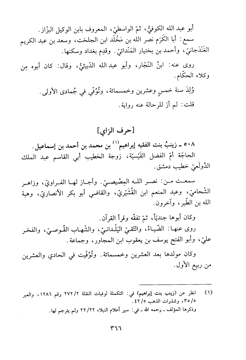 [1] انظر عن (زينب بنت إبراهيم) في: التكملة لوفيات النقلة 2/ 272 رقم 1286، والعبر 5/ 35، وشذرات الذهب 5/ 42.
