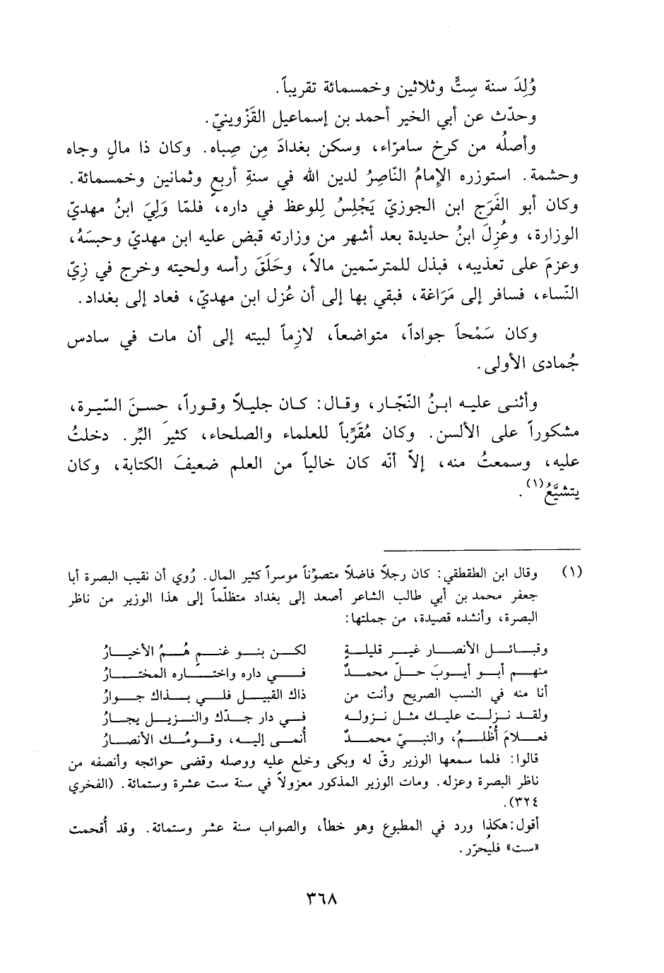 [1] وقال ابن الطقطقي: كان رجلا فاضلا متصوّنا موسرا كثير المال. روي أن نقيب البصرة أبا جعفر محمد بن أبي طالب الشاعر أصعد إلى بغداد متظلّما إلى هذا الوزير من ناظر البصرة، وأنشده قصيدة، من جملتها: