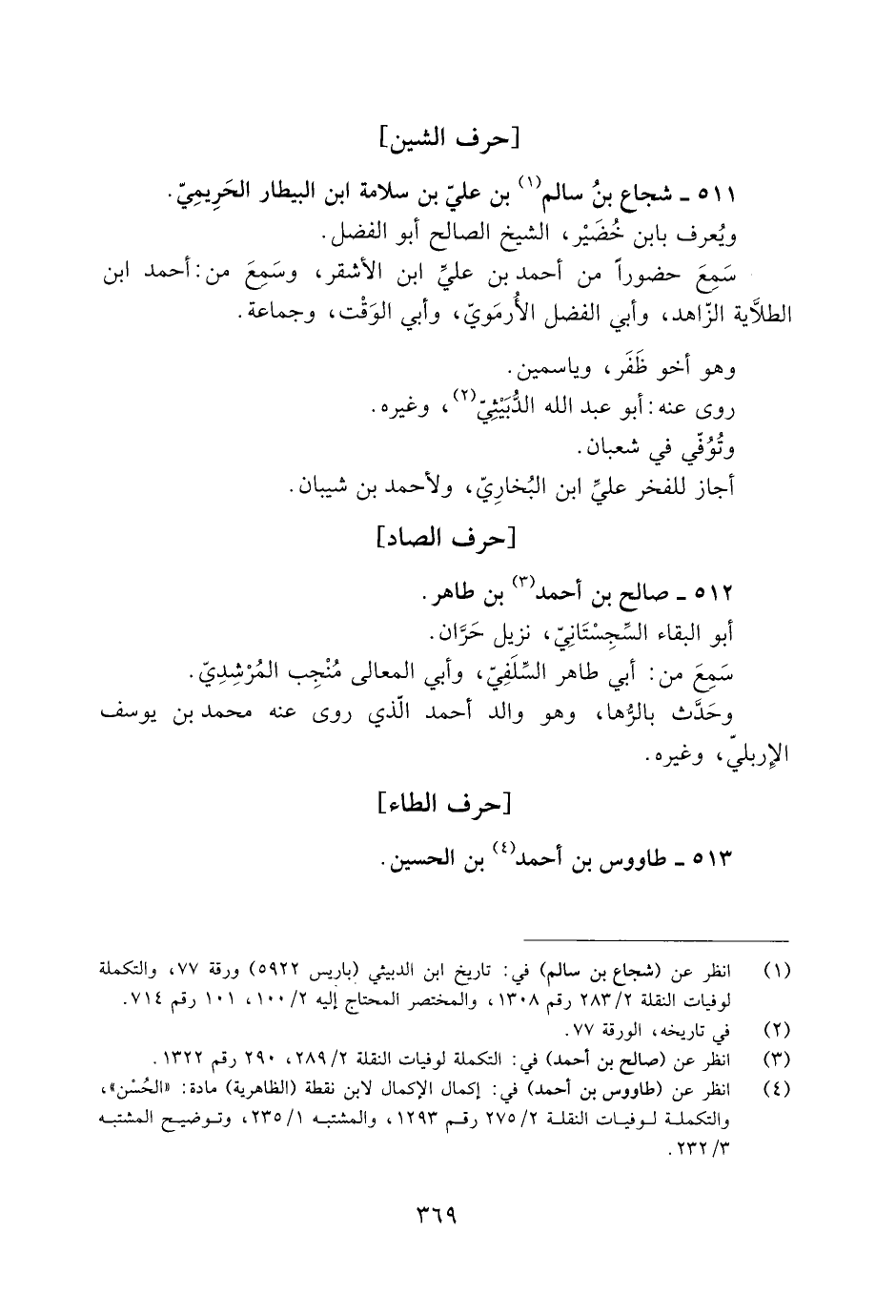 [1] انظر عن (شجاع بن سالم) في: تاريخ ابن الدبيثي (باريس 5922) ورقة 77، والتكملة لوفيات النقلة 2/ 283 رقم 1308، والمختصر المحتاج إليه 2/ 100، 101 رقم 714.